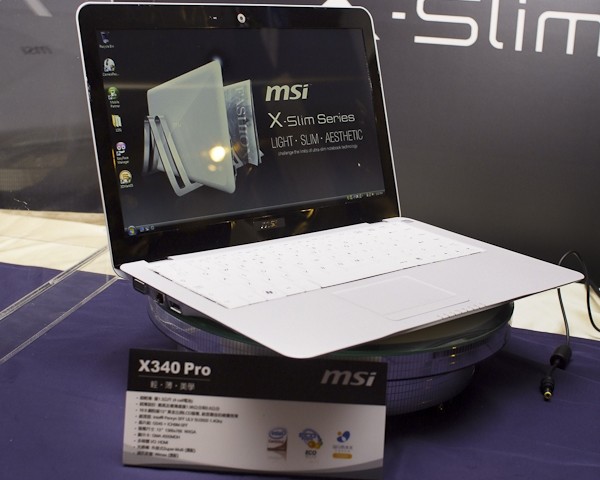 Finally, they spent some brief time with the MSI X-Slim X340, which swaps the X320's netbook credentials for some more serious ULV Penryn action and an HDMI output courtesy of the GMA4500 graphics. It tips the scales at just 2.8 pounds with the 4-cell battery, and the 13.4-inch LCD runs at 1366 x 768 resolution. According to the news yesterday, it's expected to retail under $1,000.