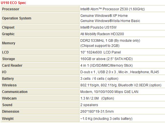 Graphics are courtesy of the ATI Mobility Radeon HD3200 GPU, while the chipset is Intel's Poulsbo US15W. Either 3-cell or 6-cell batteries are available – we'd go with the larger, since the U110 Eco is all about runtime – and although pricing isn't confirmed it should be cheaper than the U115 Hybrid.