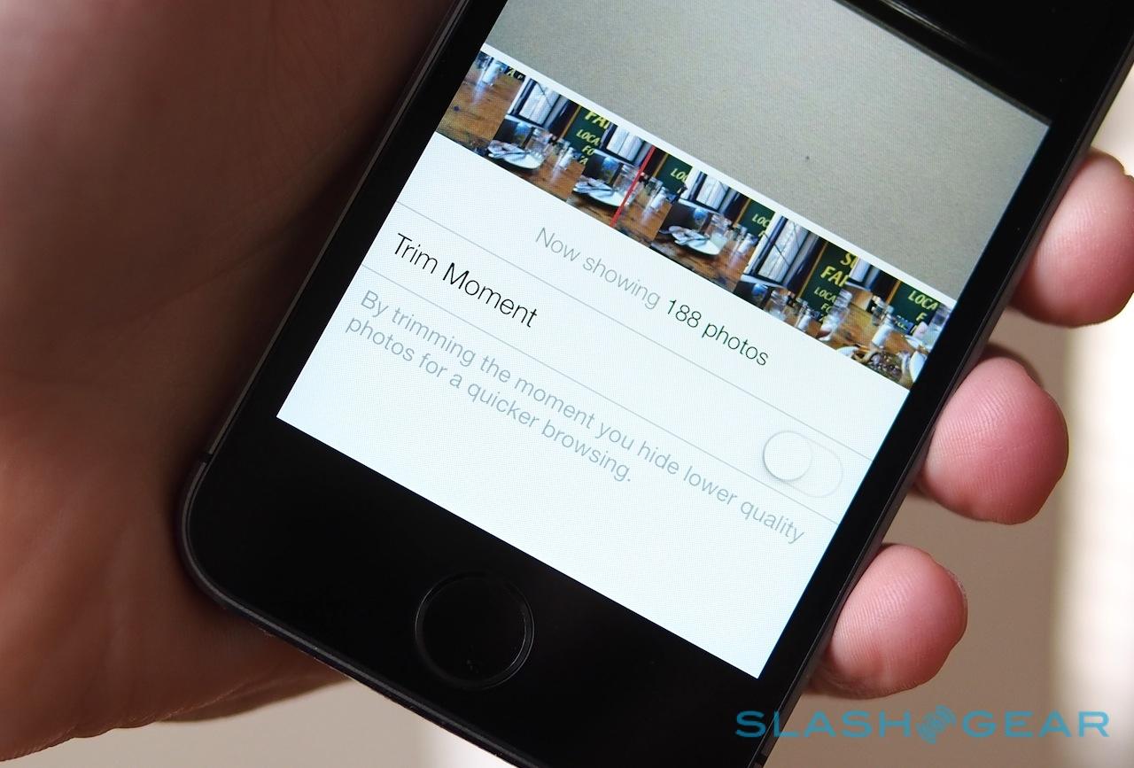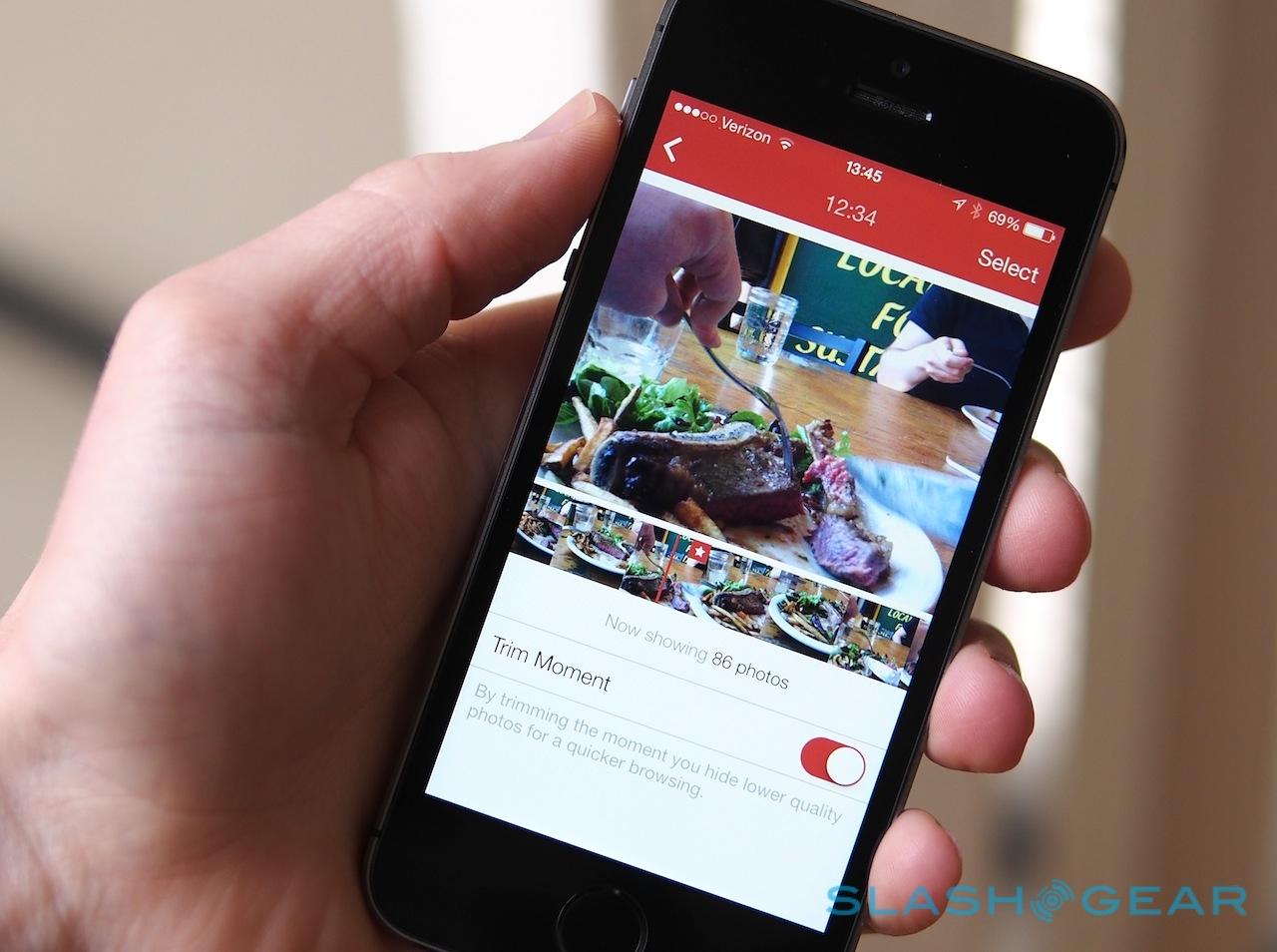 Both the iOS and Android apps are basic but functional. The main screen is a scrolling timeline of moments organized by date, some of which also get geotagged with their location. Tapping each opens up the gallery of photos, trimmed down by default; a switch underneath shows all of the pictures from that moment. A thumbnail timeline can be manually scrubbed through, or you can tap the main image and have the images automatically cycle through.