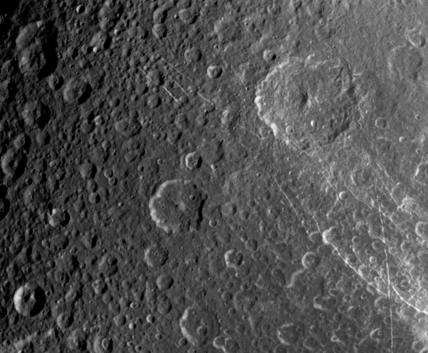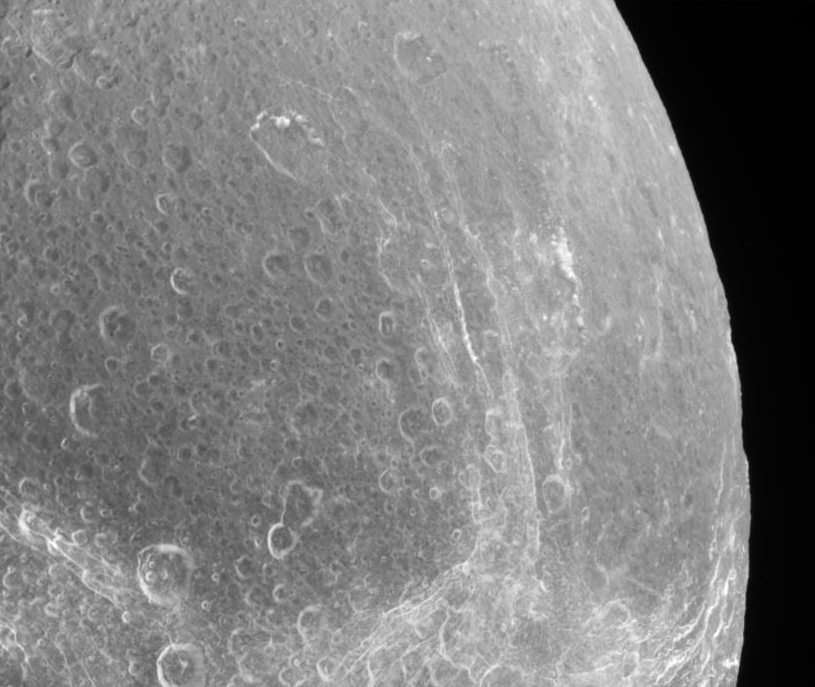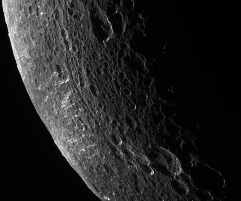 NASA's spacecraft Cassini has returned high-resolution and quite impressive images of Dione, Saturn's moon. The spacecraft took the images during its most recent flyby of the moon (earlier this week), and NASA has made them available as unprocessed RAW images, a more particular selection of which can be found at the CICLOPS website. This isn't the last we'll be getting images of Dione, though, as another flyby will be happening in a couple months with more imaging being planned.
