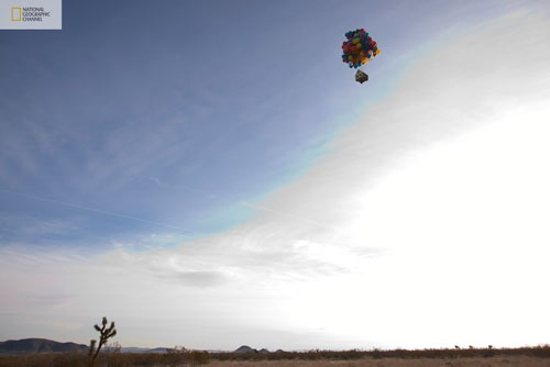 National Geographic has a new show coming soon called How Hard Can it Be? and one of the episodes of the show sees the cast recreating the flying house from Up. The project has what appears to be a lightweight shell of a house rather than the real thing. I don't think you can get enough helium balloons to make a real house fly.