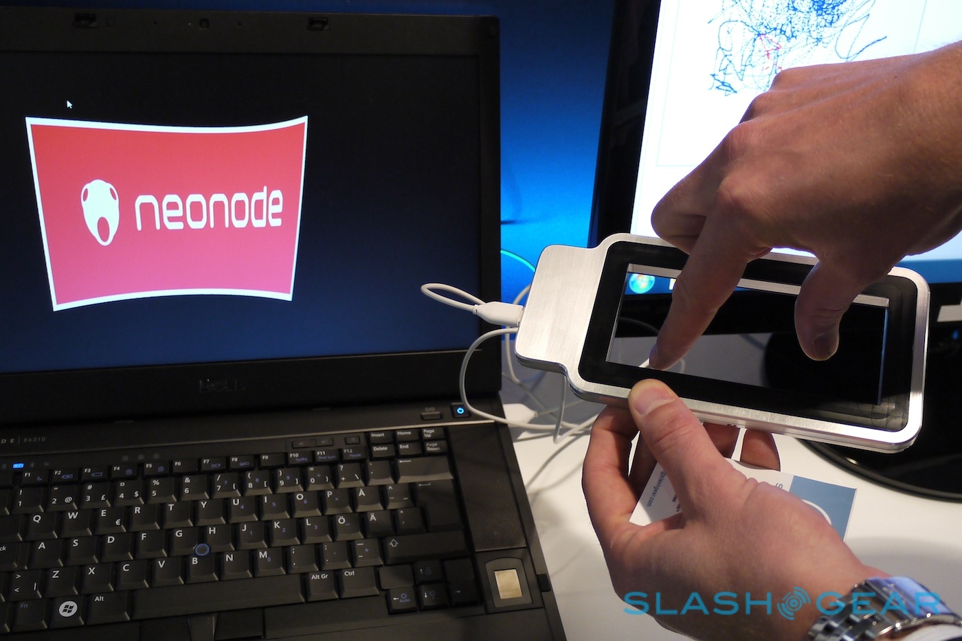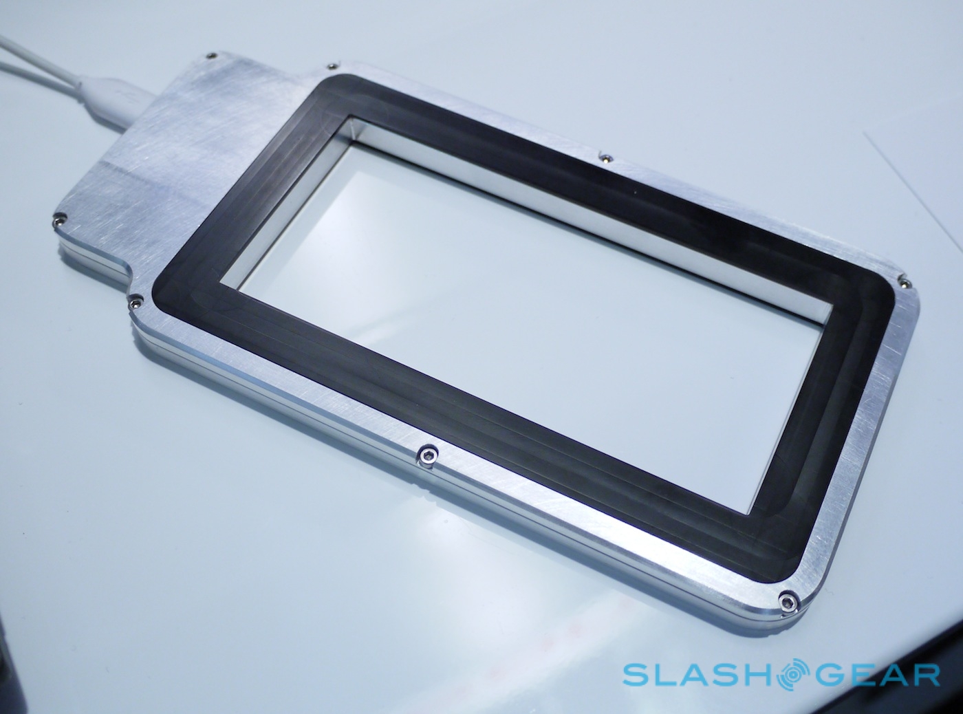 Neonode says its optical touch sensors are cheaper to implement than even resistive traditional touchscreens, at less than a dollar apiece, and even the new frame version should be a similar price. It's also artificially thick in this demo implementation: the final design could be as little as 2mm thick. In short, imagine an open section on the side of a tablet, or a pull-out frame that could lift up from a slate screen or out from the keyboard, allowing you to in effect reach into the display.