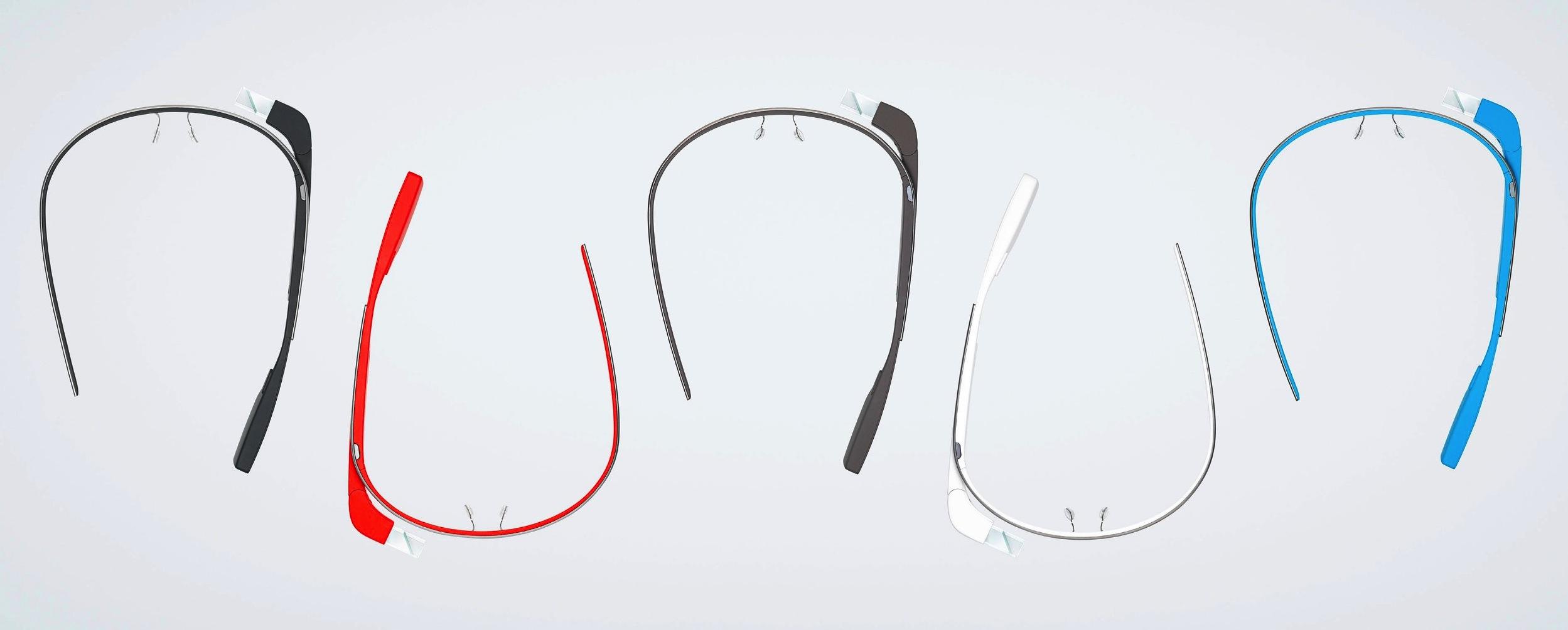 Meanwhile, there are new images of the Glass headsets, including five different colors – charcoal, tangerine, shale, cotton, and sky – and seemingly confirming that the wearable will be water-resistant. Considering it's designed to be worn all the time, that's probably a good idea. A version with sunglasses lenses attached is also shown, and we know Google is thinking about prescription lens support too. Finally, the headband itself is seemingly made from flexible metal, for better resilience.