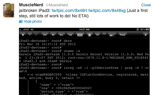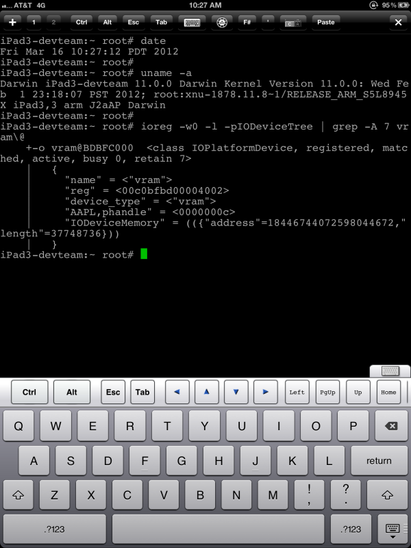 Here on the first day of its release, the new Retina-quality iPad has been jailbroken. It certainly does not take long for users on the hacking front to get their devices busted open these days, and Apple's new iPad is no exception to the rule! What you're seeing here is the first of many steps towards jailbreaking and keeping the iPad jailbroken – expect a full release of the method soon!