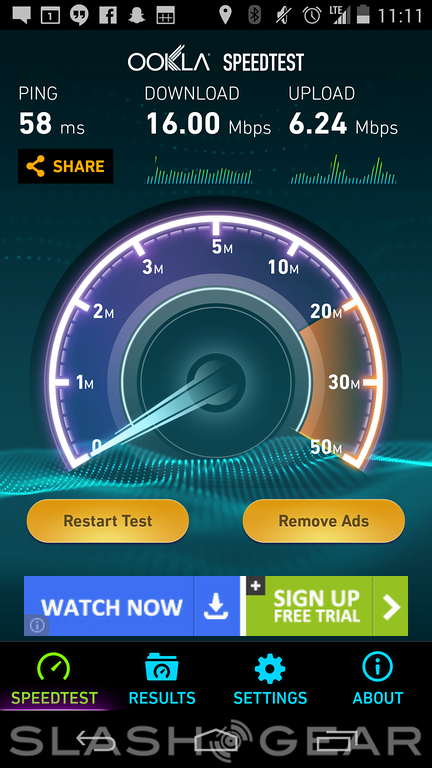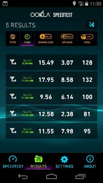 The speed tests above come from AT&T LTE in Gilbert, AZ, AT&T LTE in San Francisco, CA, and AT&T HSPA+ in Bismarck, ND, respectively. Overall, the tests have stacked up to be essentially identical to those done with the LG G2, unsurprising given it has the same Qualcomm LTE technology inside.