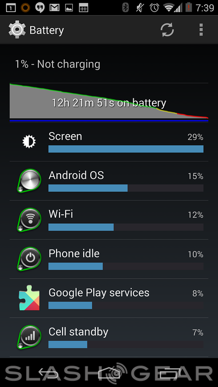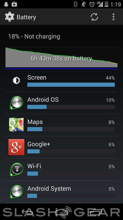 With push email turned on, a combination of LTE and WiFi connectivity, and a mixture of Google Maps, some brief media playback, SMS, a couple of short calls, and some photography, we've generally found that by late afternoon the Nexus 5 is complaining that it will soon want a charger. In a worst-case scenario, after a morning of IM'ing, some browser and navigation, and a few photos, we were keeping an eye out for a charger by 1pm in the afternoon.