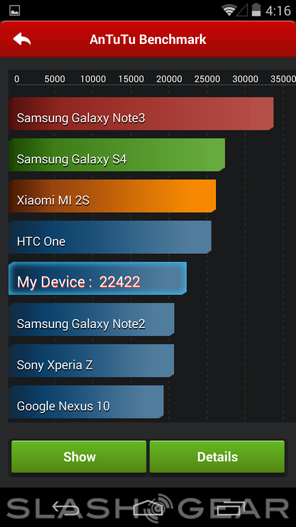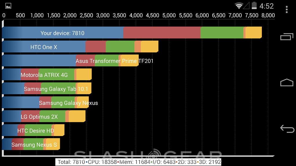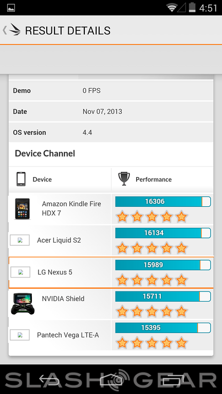 As far as how the machine performs in benchmarks, the Nexus 5 is a mixed bag. Although in some cases it seems to be powered well above the rest of its competition, in others it comes in surprisingly low on the list of the best-of-the-best. Given what we've seen this processor do in other machines recently, it's a fair assumption that this low position on ranking lists is down to the tests themselves not being entirely ready for Android 4.4 KitKat, an OS that was just released this month.