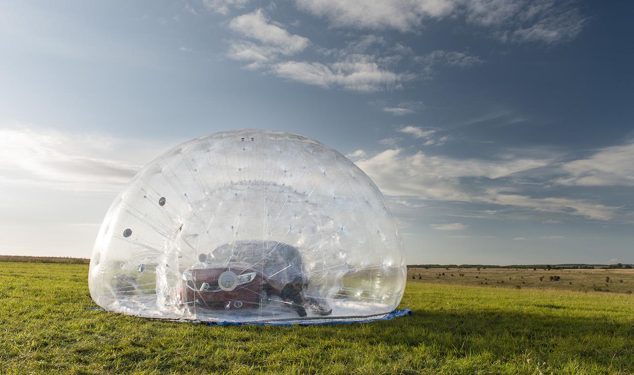 It's all clever stuff, but perhaps not as sexy and attention-grabbing as, say, a huge engine or Pininfarina-designed body, hence the outlandish bubble. Nissan constructed the Zorb out of plastic and then inflated it around the car, until it measures six meters in diameter.