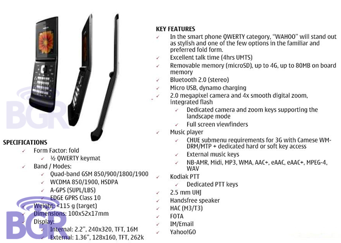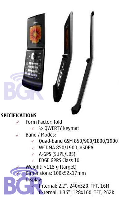 According to the latest rumors, this fuzzy clamshell is Nokia's upcoming half-QWERTY messaging phone, the comically-codenamed "Wahoo". Bearing a strong resemblance to both a Motorola RAZR and a RIM BlackBerry, the Wahoo apparently is quadband GSM and dualband UMTS/HSDPA (850/1900MHz) with a 2.2-inch 240 x 320 resolution internal display and 1.36-inch 128 x 160 external display.