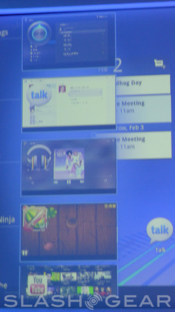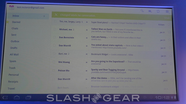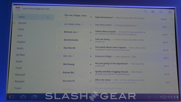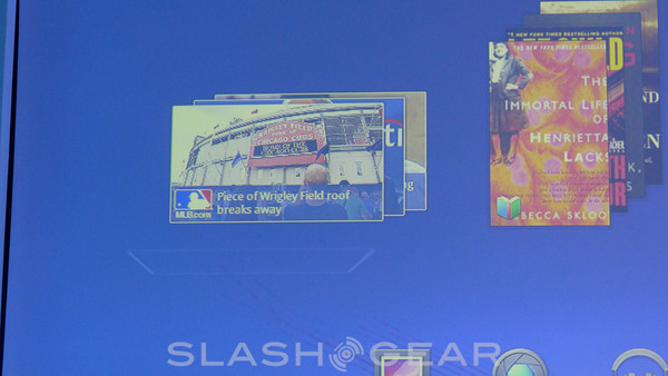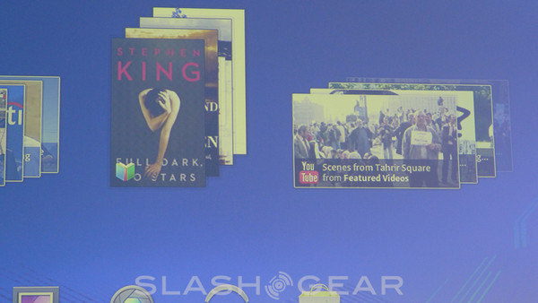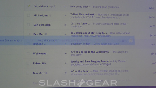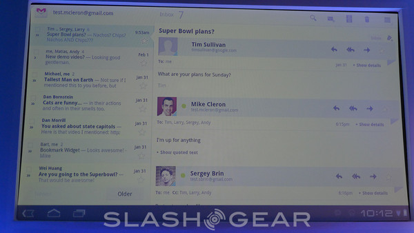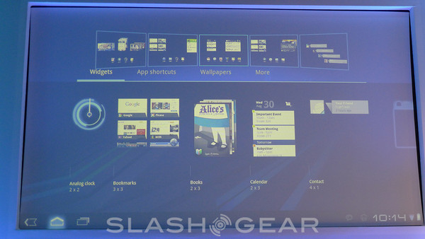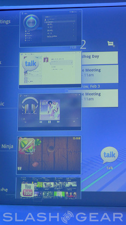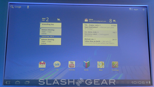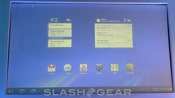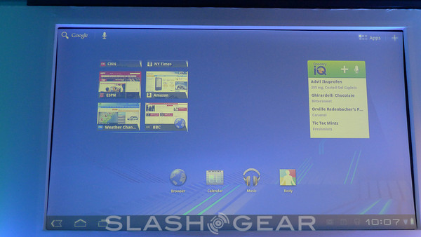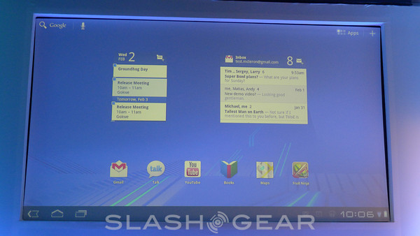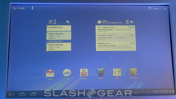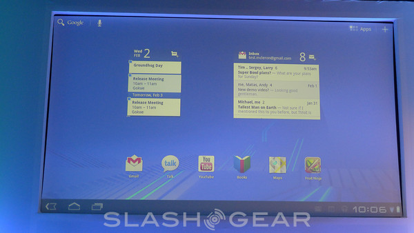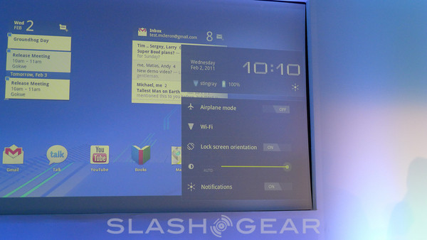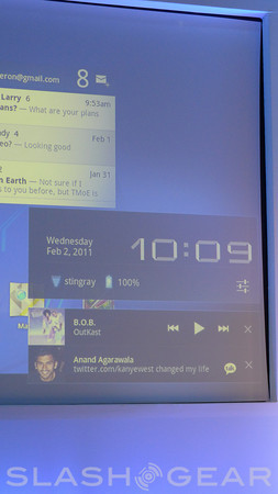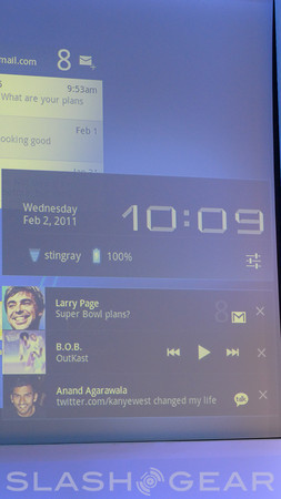 The presentation begins with the basics of the Honeycomb UI – Back Button, Home Button, and Multitasking Button are on the lower left. In the lower right, notifications and the clock. The rest is dedicated to working, gaming, and widgeting. Widget systems are now backed by collections of data, and are much more versatile than ever before. While flipping back and forth between screens, it's revealed that two widgets with scrollable content can be flipped through at the same time, such is the power of multitouch in this new system. Next – the Notification System