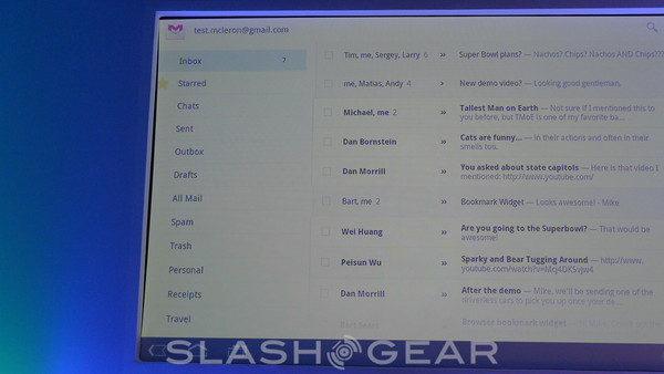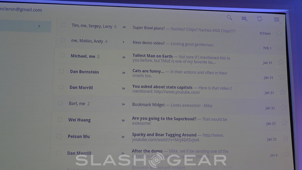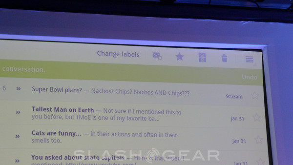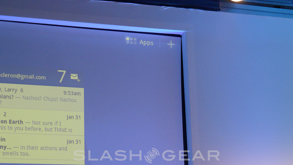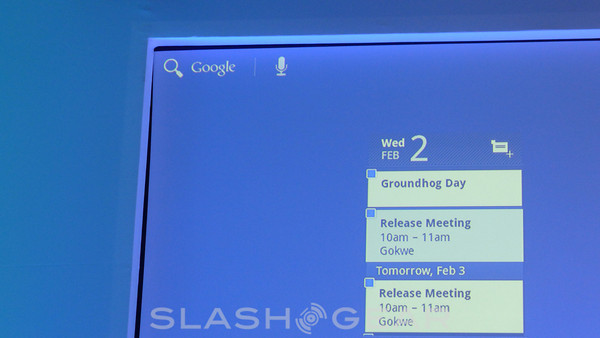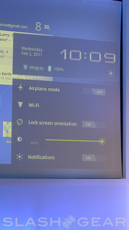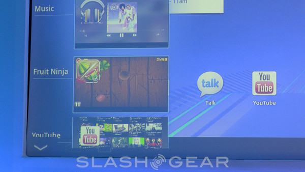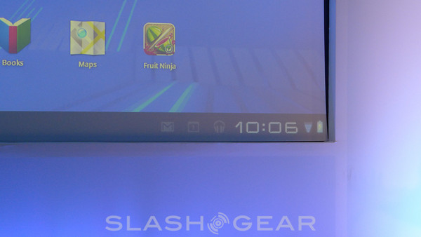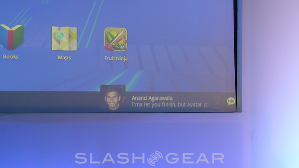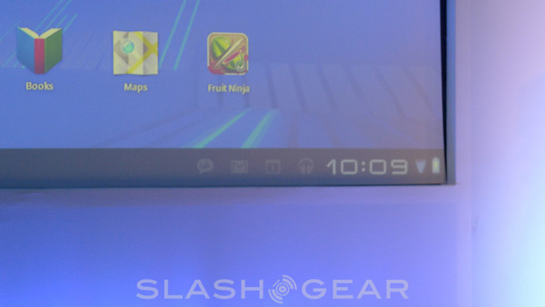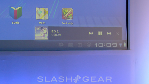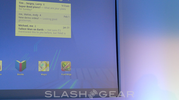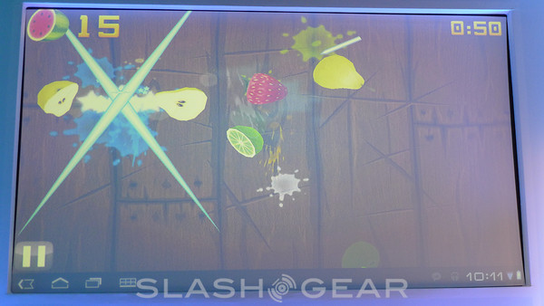 Several simple buttons are also able to pop up in the lower right hand corner including airplane mode, power, and the like. Fruit Ninja is the first game that's presented on stage, a simple slash and chop game you play by swiping your fingers across the screen. This version is a completely unmodified state, yet works perfectly well without any change, but Google wants you to modify your apps to work especially well with this new tablet form.