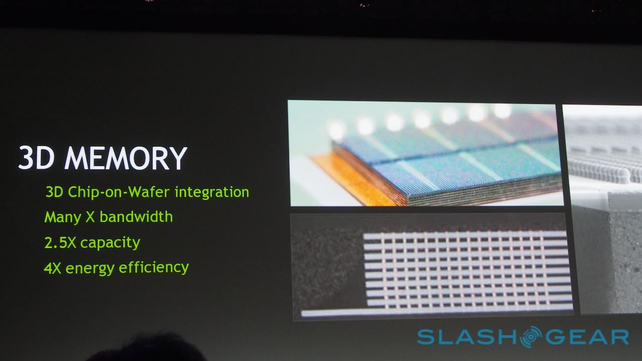 3D Memory stacks chips for the first time in NVIDIA's GPUs, using Chip-on-Wafer integration to increase capacity by 2.5x and increase energy efficiency by 4x, not to mention an exponential increase in memory bandwidth.