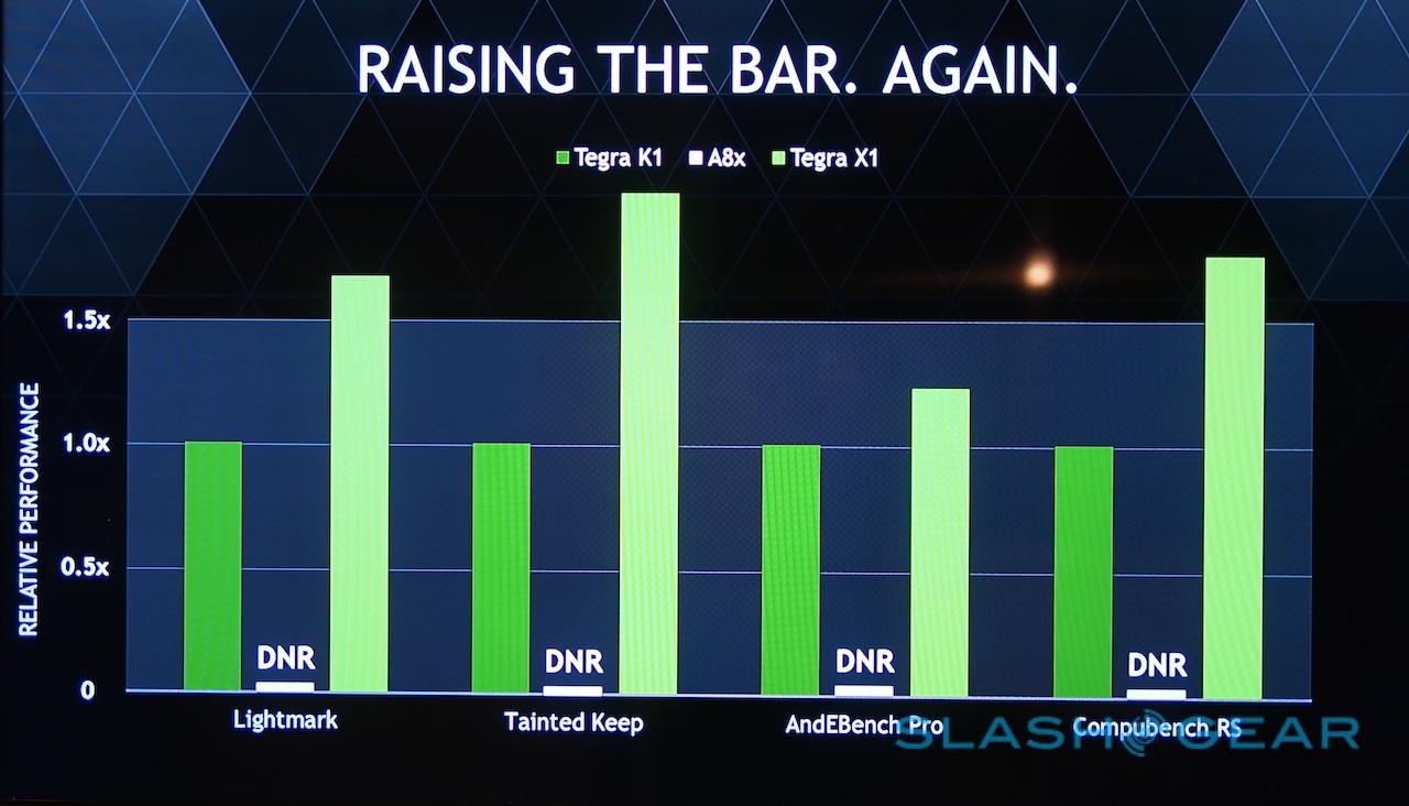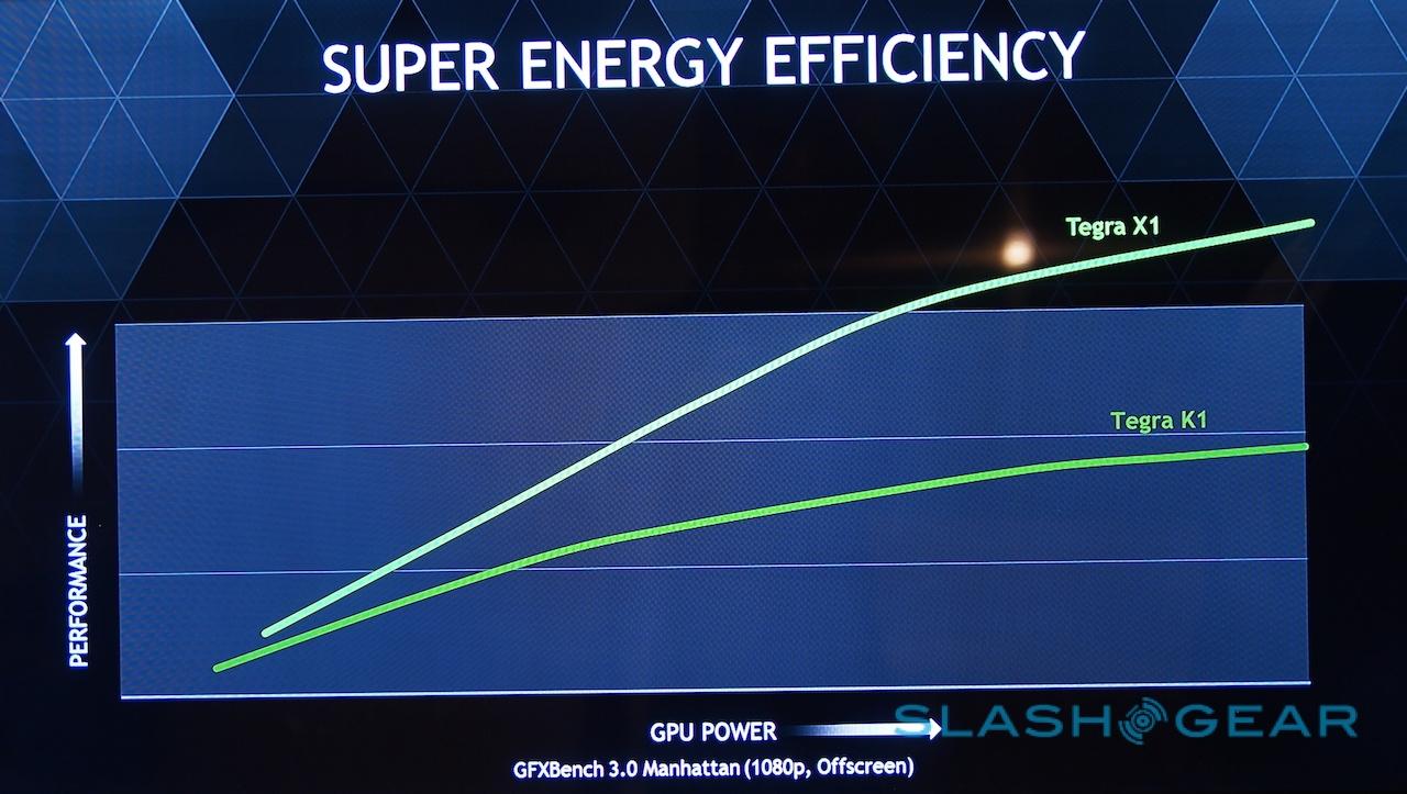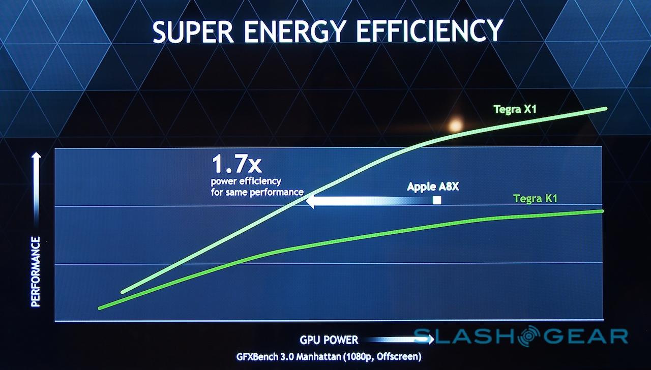 So, for about the same power consumption, the Tegra X1 will offer roughly double the performance of the K1. Throttled back to match the graphics performance of Apple's A8x in the iPad Air 2, meanwhile, the X1 supposedly delivers 1.7x the power efficiency.