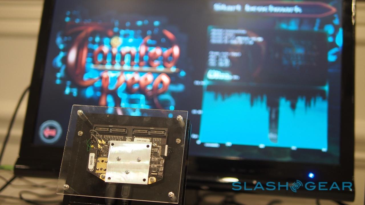 NVIDIA's reference board is as you'd expect: a postcard-sized slab with the basics to get manufacturers going. For the benchmark demonstration, the engineers had bolted a heatsink to it to replicate the sort of cooling prowess an average tablet would have.