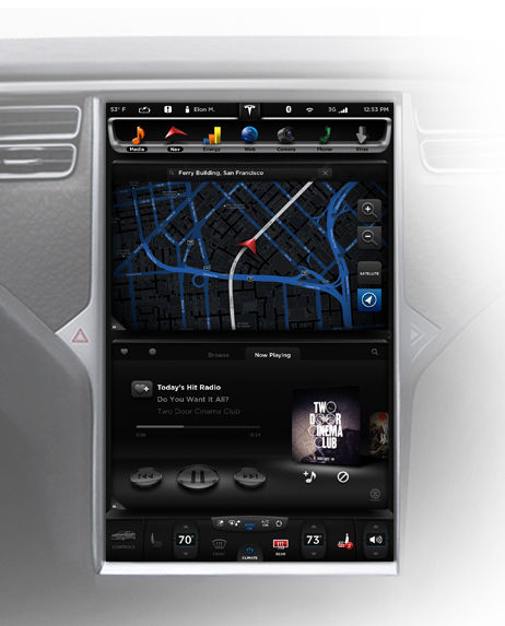 What you'll see inside the Tesla Model S powered by NVIDIA is both giant displays working with VCMs bursting with graphics power. The larger of the two screens will have primarily information regarding gas, speed, and car functions with next-level aesthetics making sure the look doesn't disappoint the power of the rest of the vehicle. The center console then is not one to play second fiddle, working with 3D graphics (more like 2D appearing to look 3D, not the glasses-necessary kind of situation).