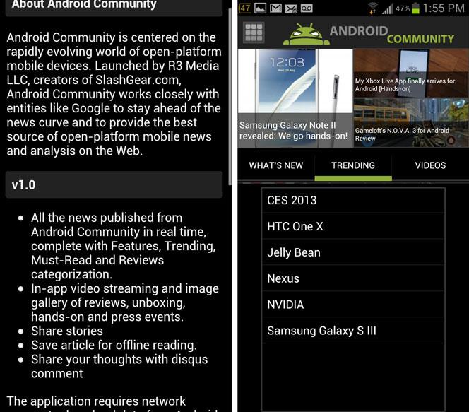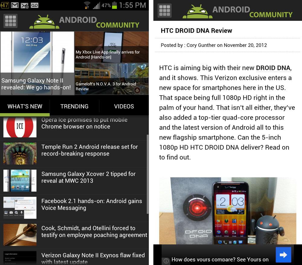 You'll be working with several different tabs here in the Android Community app, the first and most-traffic'd of these being "What's New", aka the main news feed. You'll be able to check the hottest Trending categories as well as access Must Read and Featured sections too. Also included is a Reviews section, the last three listed here accessible by you by hitting your Android menu button and Sections button.