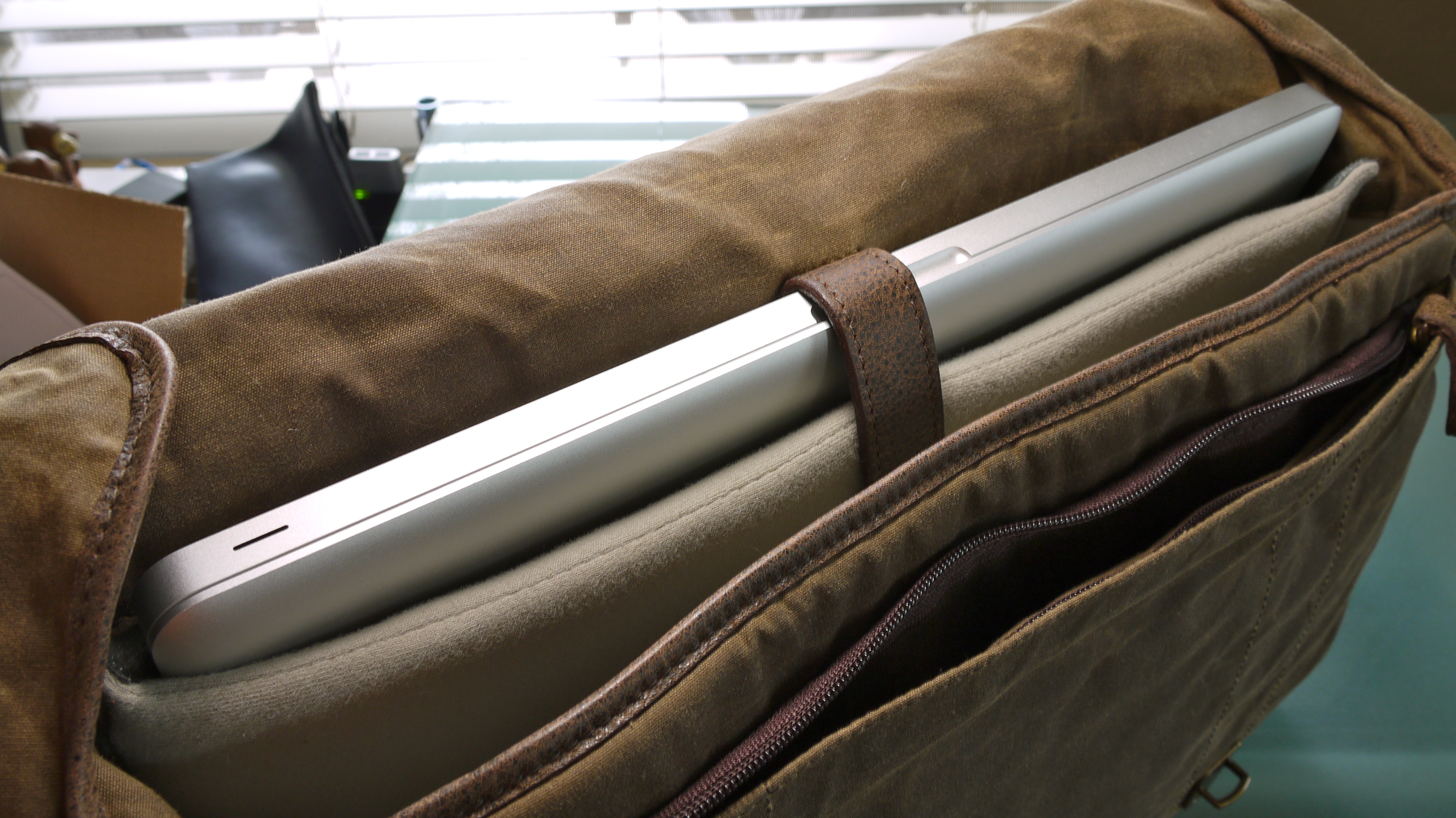 There's room in well-bolstered, adjustable sections for up to three lenses or flash units, together with a full-size DSLR, and then a laptop in the removable side pouch. A 13-15-inch MacBook Pro slotted in easily with a leather strap to hold it in place.