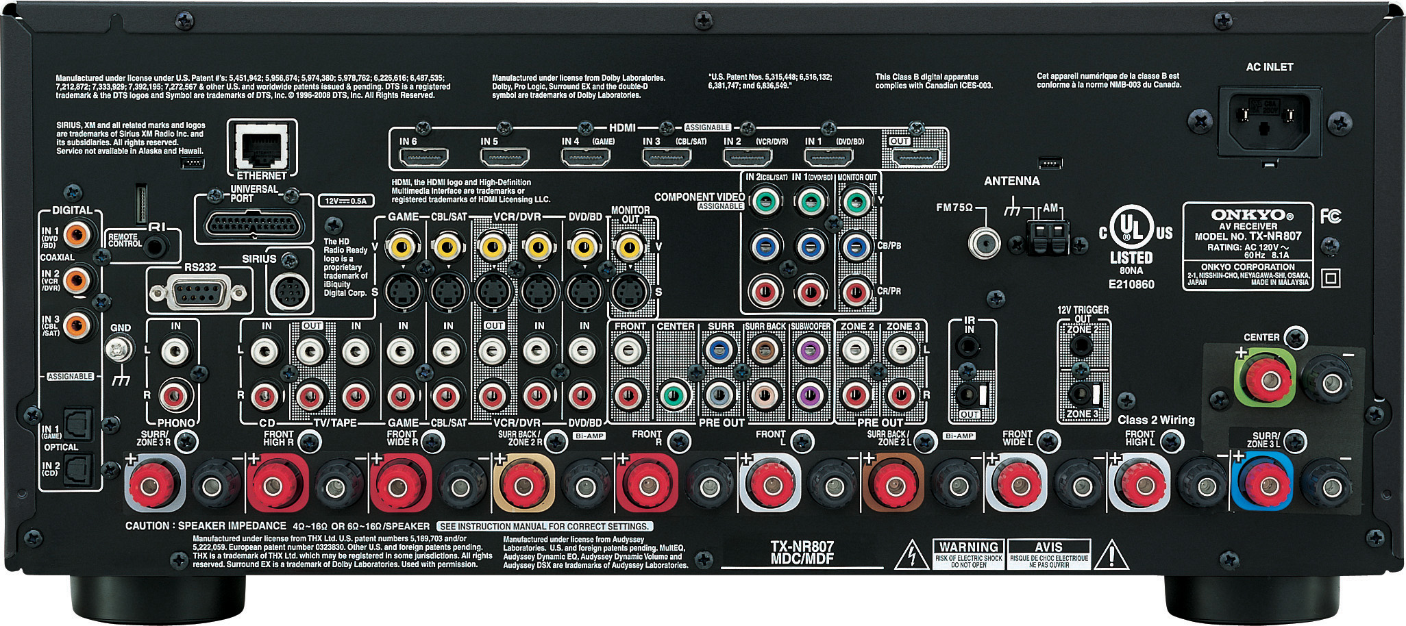The TX-NR807 has seven powerful 135-watts-per-channel Onkyo WRAT (Wide Range Amplifier Technology) amplifier sections for high output and low distortion, offering a dynamic power rating of 300 watts into 3 ohms. It has an extensive array of analog and digital inputs and outputs, including an MM/MC phono input. Its multiroom audio capabilities are similarly extensive with Powered Zone 2 and 3 capabilities, multiple DC triggers, bidirectional RS-232, and Onkyo's exclusive Universal Port for connection of an optional iPod Dock and HD Radio tuner.