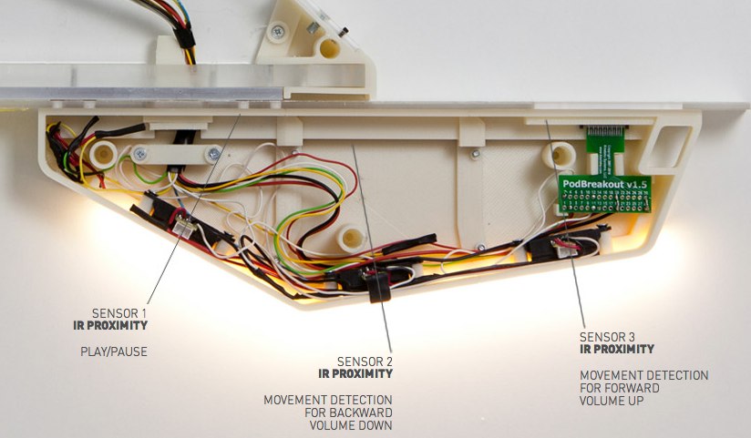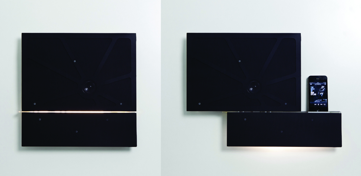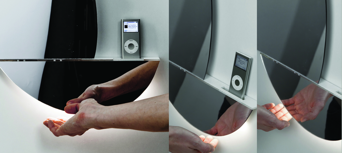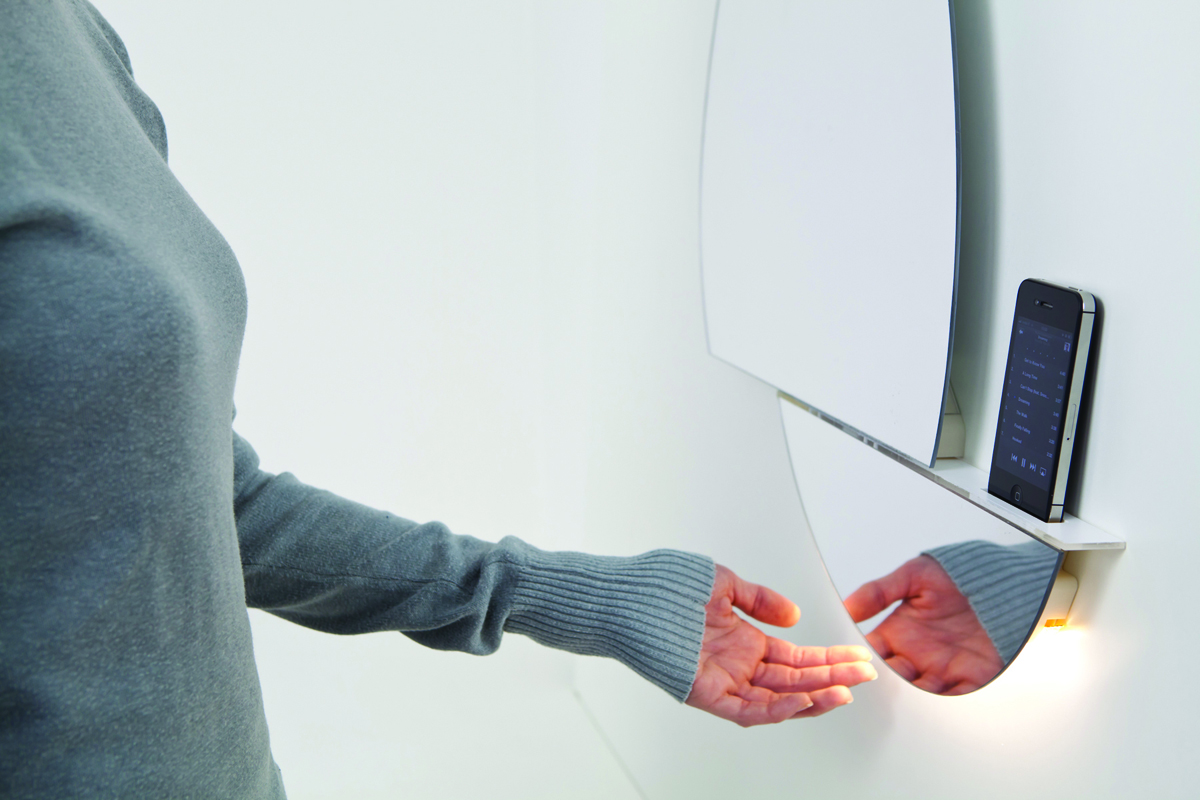 The top section slides to the left to reveal the iPod dock connector, while illuminated controls under the bottom edge use IR proximity sensors to handle play/pause, volume up/down and track skip/back. That means you could use the Open Mirror in a kitchen where you might not want to stab at buttons with greasy or wet fingers.