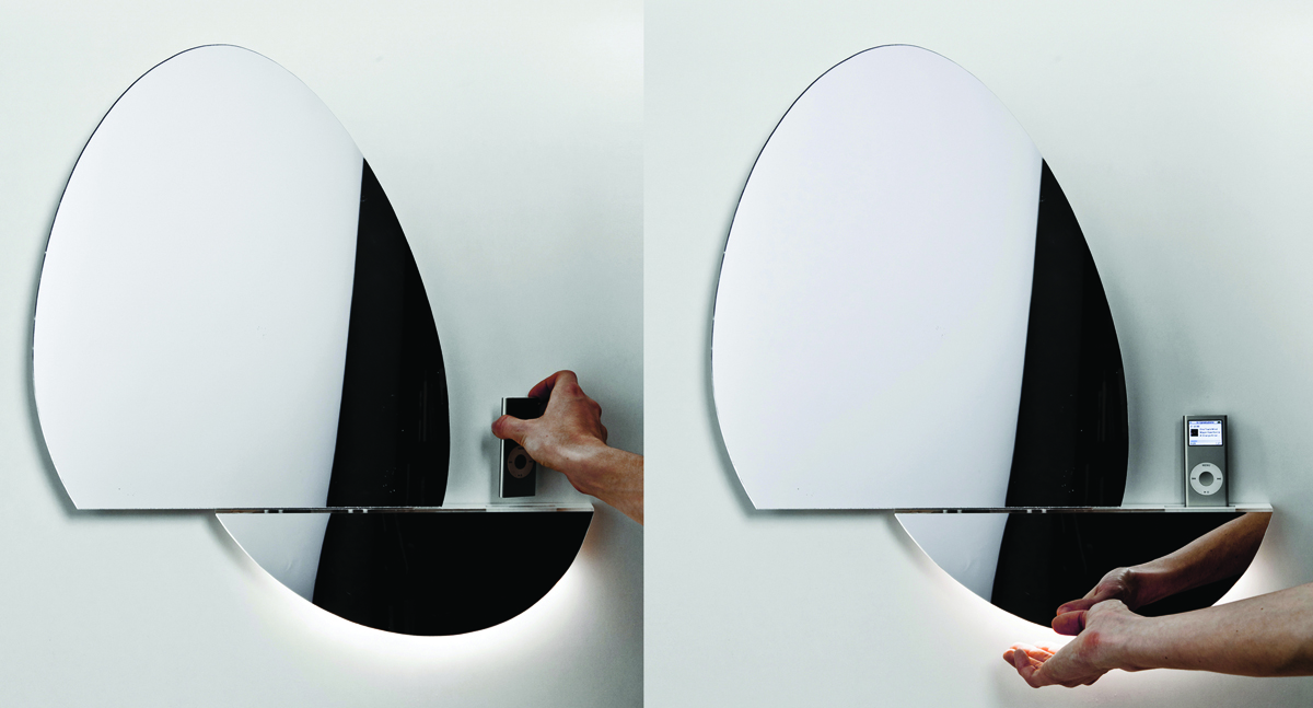 Always wanted a swish Bang & Olufsen CD player with the sliding doors, but migrated your musical life to iPhone or iPod? Italian firm Digital Habits might have the alternative in the oval shape of Open Mirror, a custom iPhone/iPod dock with integrated speakers, motion-tracking controls and a mirror ideal to practice your lip-syncing skills in.