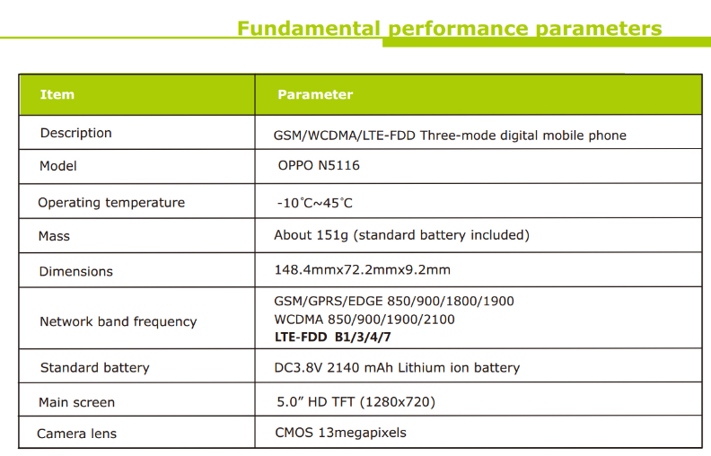 The battery capacity is listed as 2140mAh, lesser than the N1 but expected given the smaller size. Unfortunately, no other specs are available from the manual or related FCC materials, but all signs point towards a smaller version of the Oppo N1.