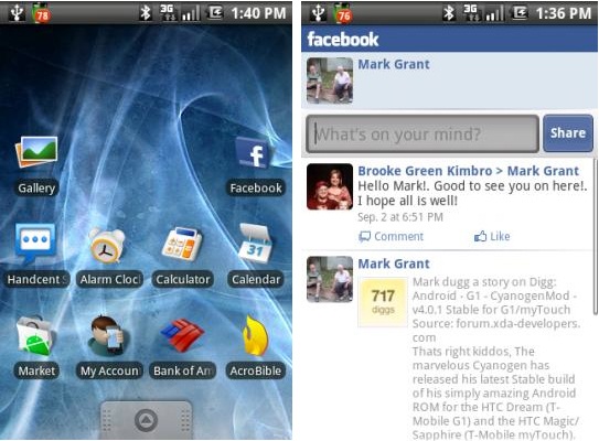 Meanwhile Facebook for Android is also free, though early feedback isn't quite as glowing. There's no messaging or chat support, and photo viewing shunts you into the browser to the mobile version of Facebook's site. However, it does offer access to Facebook phonebooks, courtesy of a live folder on the homescreen.