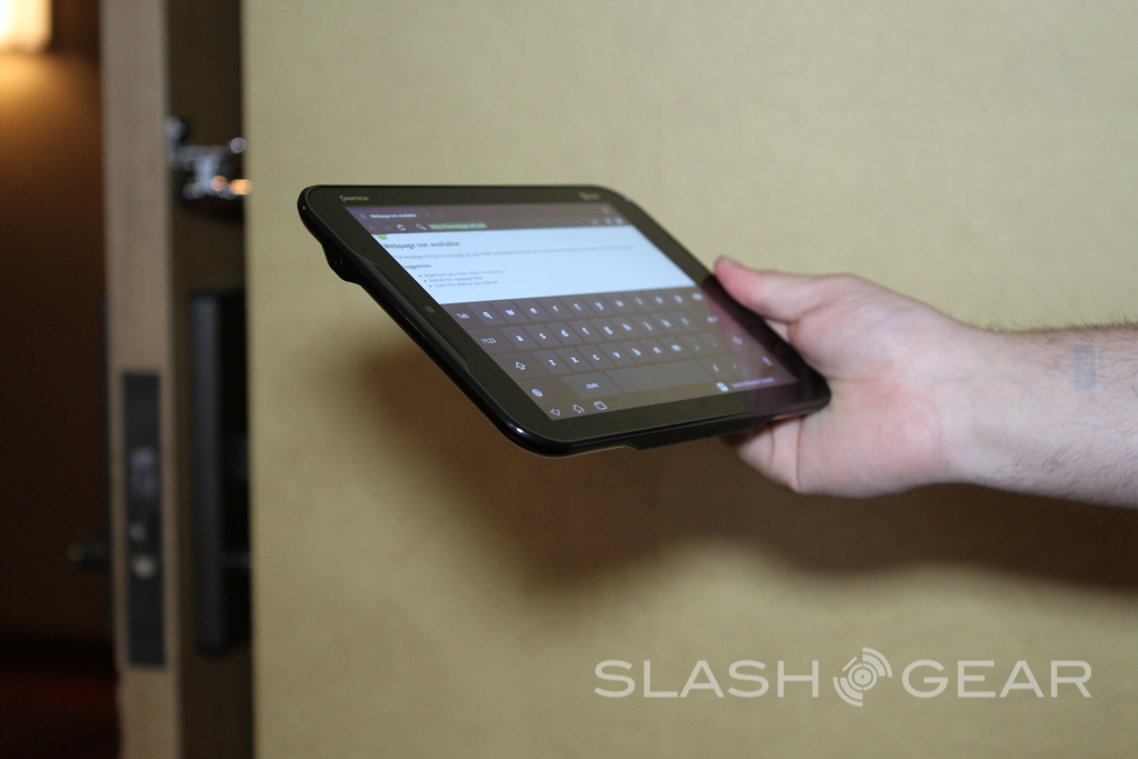 This tablet has a 5 megapixel camera on the back, a 2 megapixel camera on the front, and works with Bluetooth Stereo 2.1. The big money item on this device seems to be the waterproof nature of it, complete with IP57 certification and the ability to dunk in your bathtub for a full minute. We both literally saw it dunked in the water the entire time it was being presented on stage earlier in the day and we had our own dunk test performed for us here –
