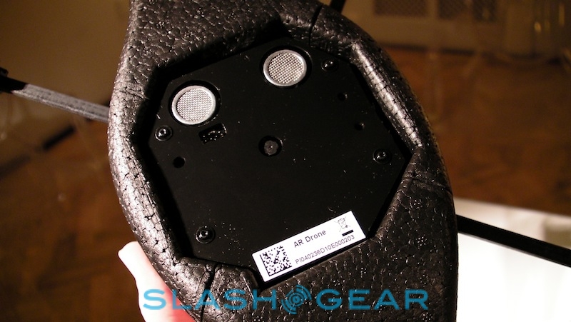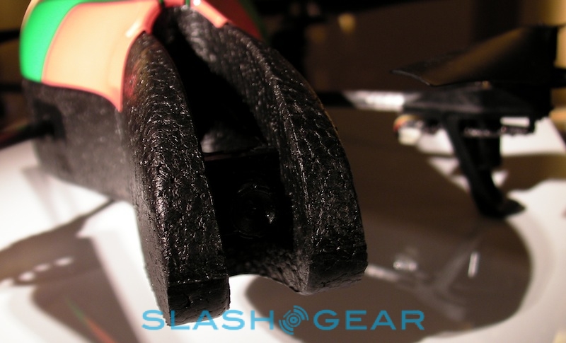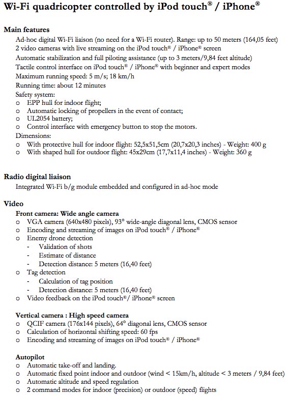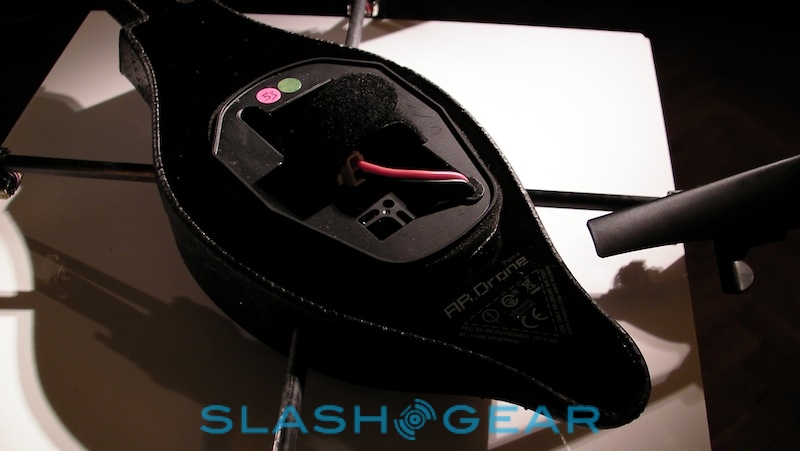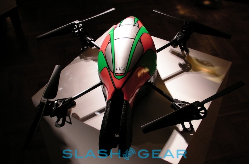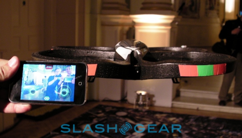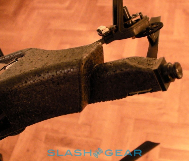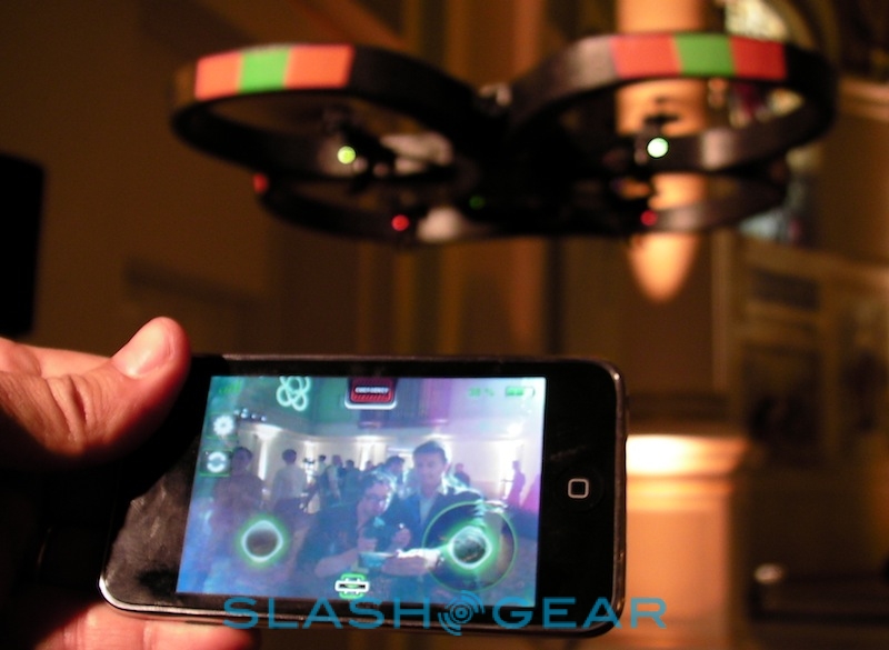 Parrot tells us there have been plenty of changes since the AR.Drone made its debut at CES back in January 2010. They include hardware tweaks to the quadricopter itself, adjusting the balance and weighting among other things, together with multiple updates to the control software. Currently that's written for iPhone or iPod touch – and presumably in "doubled" mode on the iPad – but since Parrot have released the AR.Drone API publicly, they're expecting developers to code up versions for Android and other platforms in short order.