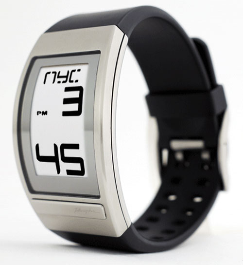 The new watch is called the World Time Curved E Ink Watch. It can be had with a black polyurethane band, white band, black leather band, or a stainless band. Either of the polyurethane colors sell for $150, the black leather one sells for $165, and the stainless band version is $195.