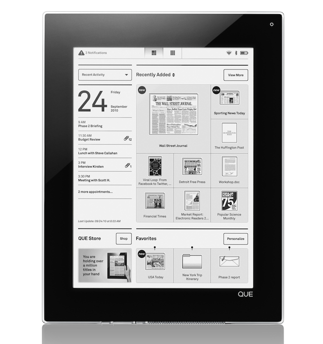 With its sleek 8.5 x 11 inch form factor, crisp large touchscreen display, intuitive user interface and powerful tools, QUE stands out in the crowd. QUE is currently on display at the Consumer Electronics Show in Las Vegas (Central Hall of Las Vegas Convention Center at Booth 11840 anchoring the e-Book Techzone).