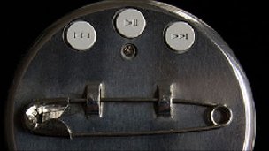 As for the design, it's as simple as it gets: an MP3 player that's meant to look like a small bade, or button. Controlling the music is just as simple as the design. Three buttons on the back of the button: play/pause, skip back, and skip left. There's no way to take the music off the badge, and there's no way to put music onto it. You also can't shuffle the music on the button, either.