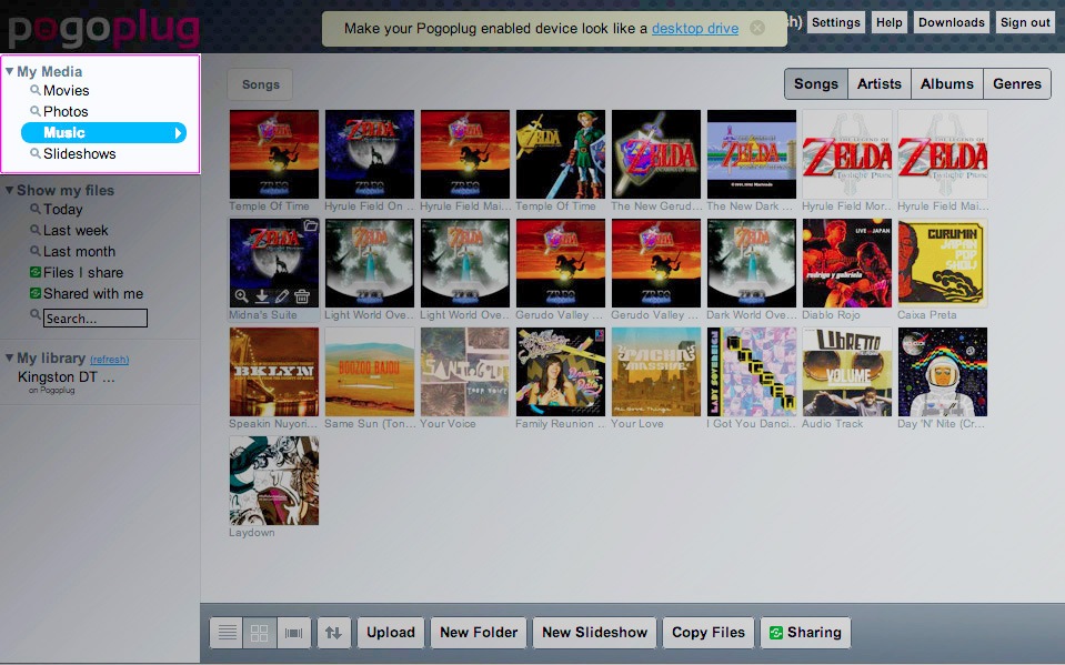 Pogoplug automatically displays music by Album, Artist and Genre, and shows cover art for quick access to a user's favorite music. Photos are now displayed by photo timeline and videos are only a click away, including the ability to watch a preview in the thumbnail itself.