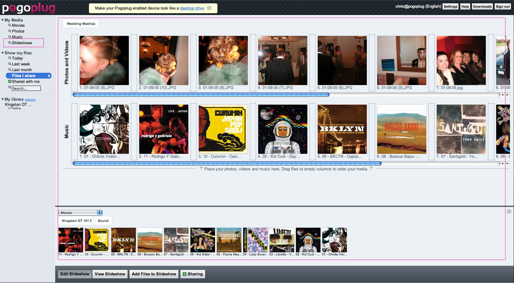 Users can easily create and share fun and engaging slideshows using their stored photos, videos and music. Creating a slideshow with Pogoplug is as simple as drag and drop, and sharing these slideshows is just as easy as ever. Once a user's link is shared and viewed, their slideshow will immediately begin with the photos, videos and music they selected, playing seamlessly in the viewer's browser.