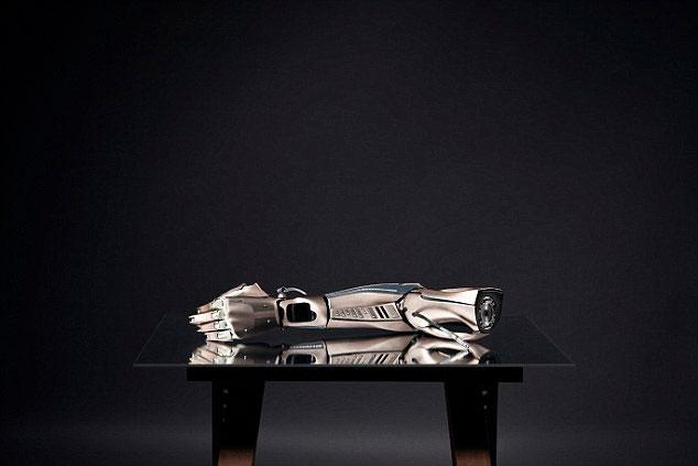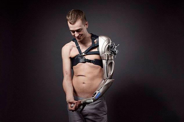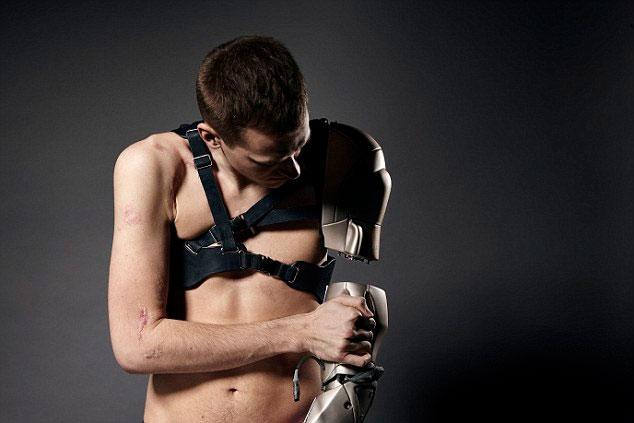 The limb in question is connected to the nerves and muscles in the shoulder and the bionic arm was fitted at the studio of a prosthetics artist called Sophie De Oliveria Brata, creator of something called the Alternative Limb Project. James' prosthetic is a metal arm with attached articulated plastic hand that is worked by muscles in the shoulder. Muscle signals are detected by sensors attached to the skin of his shoulders that are connected to a harness on the top of the body that operates the arm and hand. A battery powers the works.