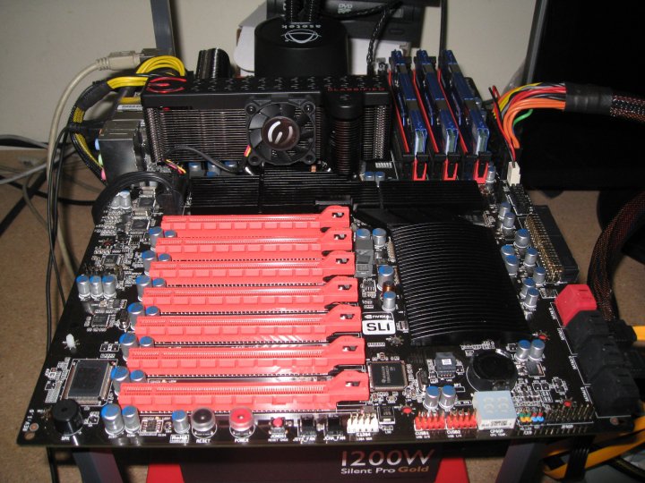 There isn't much in the way of detail beyond the photos themselves, but the setup is based on an EVGA X58 Classified 4-way SLI motherboard. The $499 'board has a full seven PCIe x16/x8 slots and will take up to four of the company's GTX 400-series video cards.