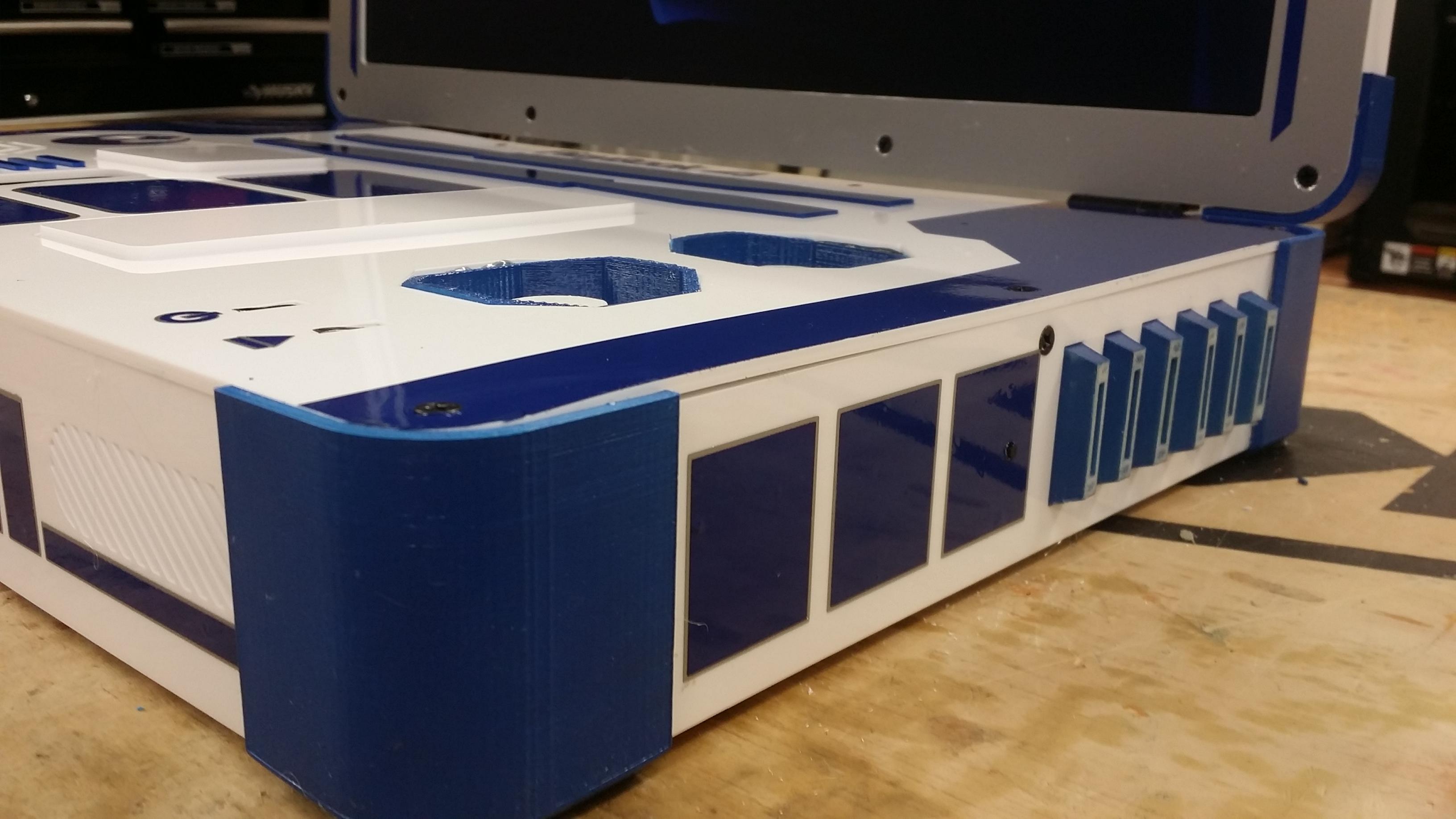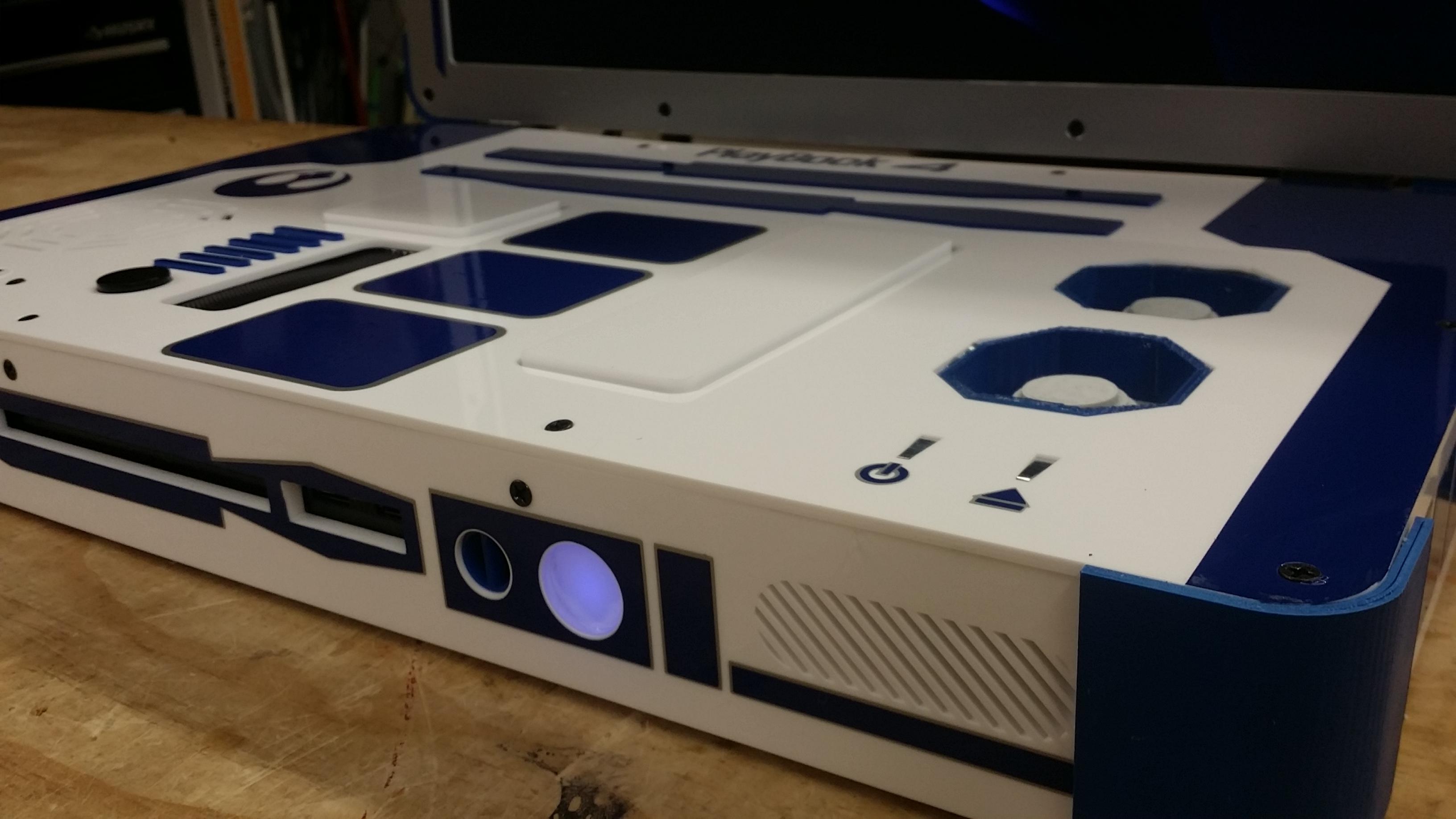 We also see the familiar R2 red light and on the Playbook 4. That red light changes between red and blue randomly while the PlayBook 4 is turned on and operating. The addition of an Adafruit WAVEshield to the build allows the R2 PlayBook 4 to talk. Check out the video below to see the R2-D2 themed PlayBook 4 in action. I'm not sure if you can actually buy this R2 version or what it might cost, the normal version from last year sold for $1395 including the PS4.
