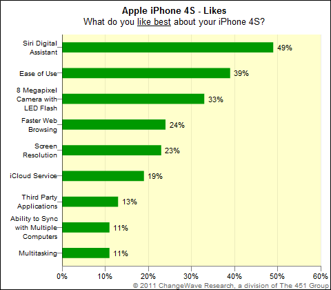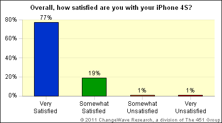 An overwhelming majority of iPhone 4S owners are "very satisfied" with their new Apple device, and in particular, of the onboard Siri Digital Assistant. According to a new survey released by ChangeWave Research, 77 percent of iPhone 4S owners reported being "very satisfied" with their purchases, with Siri at the top of the list of most-enjoyed features. The survey also showed that customer satisfaction ratings for the latest Apple iPhone are higher than that of its predecessor, the iPhone 4. And to say that the 4S was only a lateral step for new Apple tech? Apparently the majority of people don't think so.