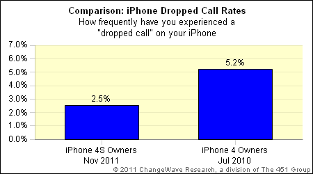 So far, the largest complaint (38 percent of surveyed users) about the iPhone 4S was directed towards the short battery life, while 30 percent stated that they didn't like the lack of 4G wireless connectivity speeds (no LTE yet for the iPhone). Dropped calls, which historically ranked as one of the biggest complaints for the iPhone, remain a negative. Only just 8 percent cited excessive dropped calls as a problem, the result of AT&T improving its network (finally) but also perhaps due to the fact that the iPhone 4S is also available on other, well, shall I say, more consistent (at least in California) networks like Verizon.