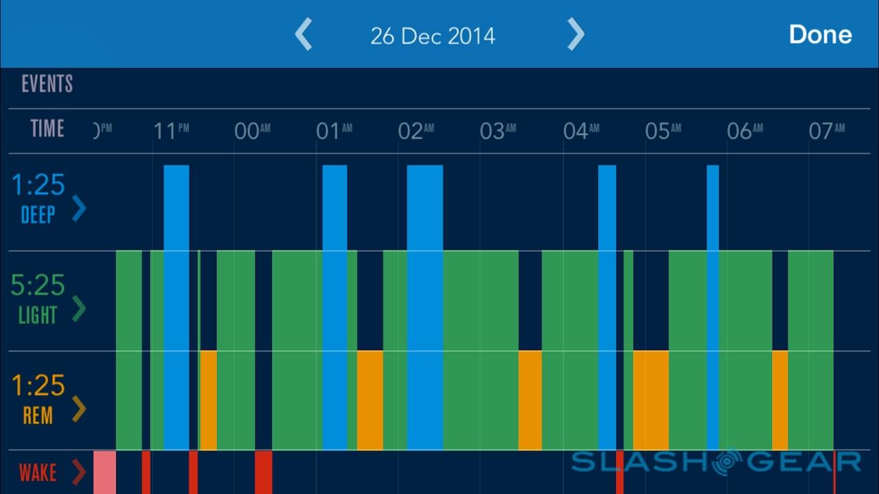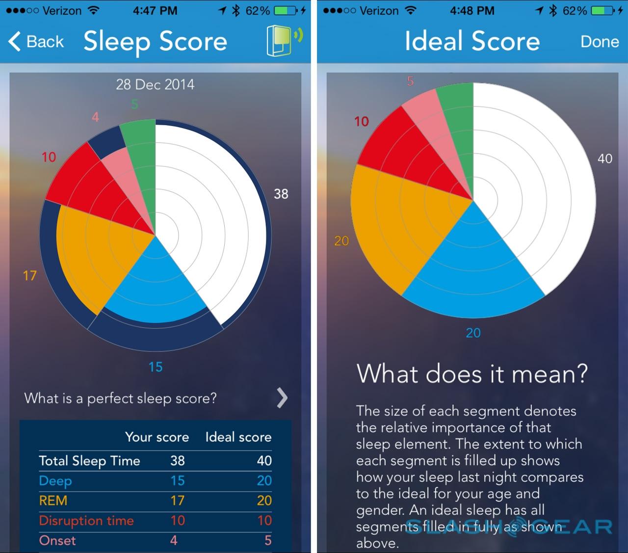 Tapping into your score shows how it was calculated, with different chunks of a pie chart allowed to each of those four factors along with sleep onset. If you want, you can see an hour-by-hour chart of your various phrases through the night.