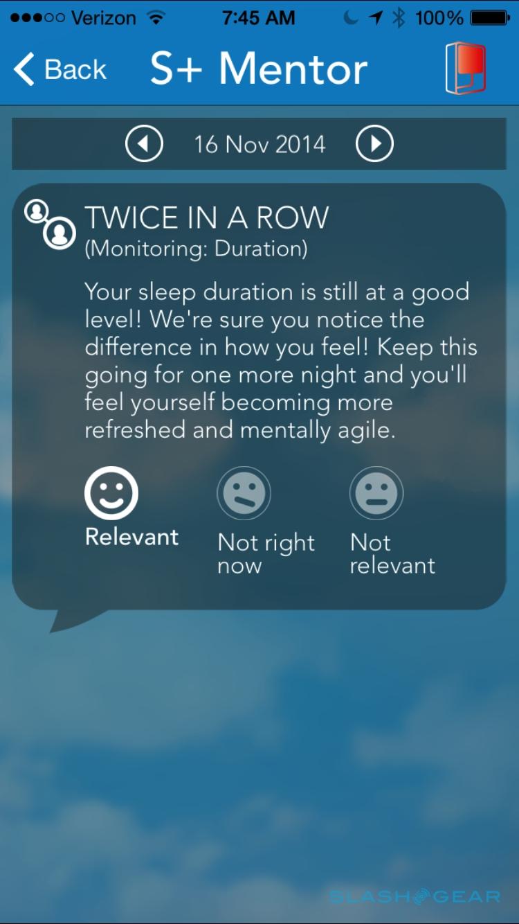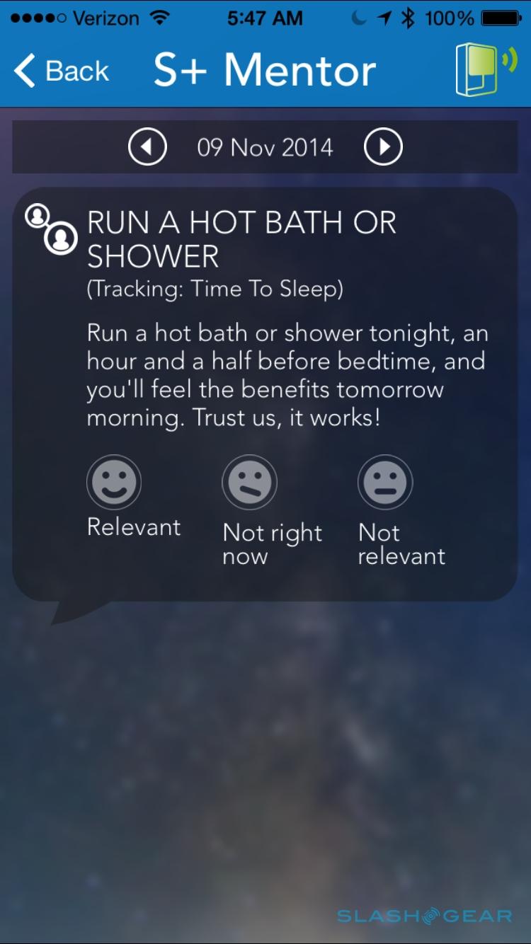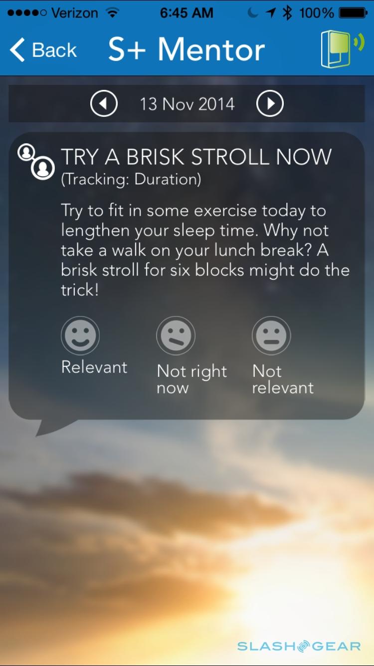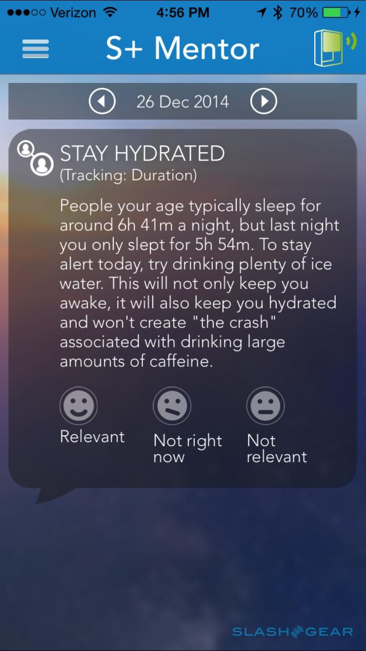 For instance, after a particularly short night's sleep, S+ Mentor recommended drinking ice water over coffee, because the temperature would perk me up without the caffeine to keep me awake again that evening. After a few days where I had trouble getting to sleep, it suggested I might want to do some light exercise in the early evening, as even a small amount of exertion can help you doze off more readily. A reminder was duly served up later on, to nudge me to take the hint.