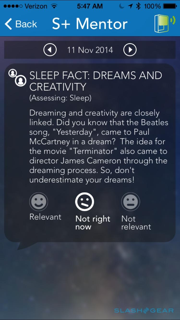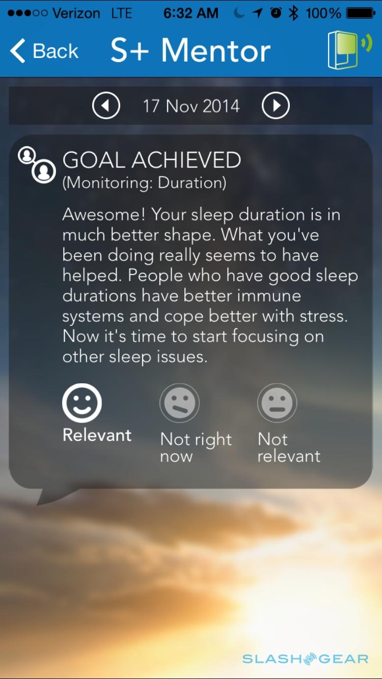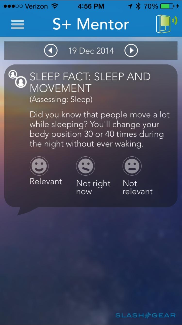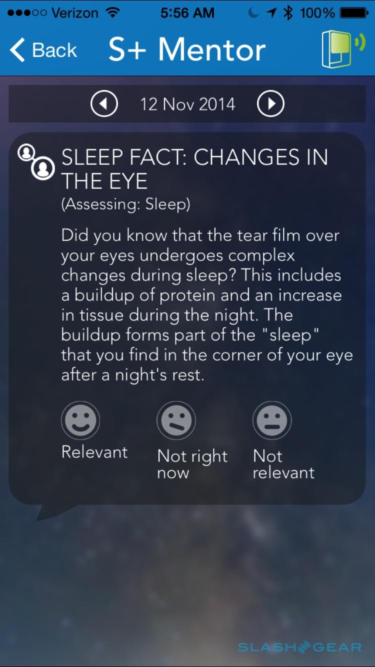 For instance, after a particularly short night's sleep, S+ Mentor recommended drinking ice water over coffee, because the temperature would perk me up without the caffeine to keep me awake again that evening. After a few days where I had trouble getting to sleep, it suggested I might want to do some light exercise in the early evening, as even a small amount of exertion can help you doze off more readily. A reminder was duly served up later on, to nudge me to take the hint.