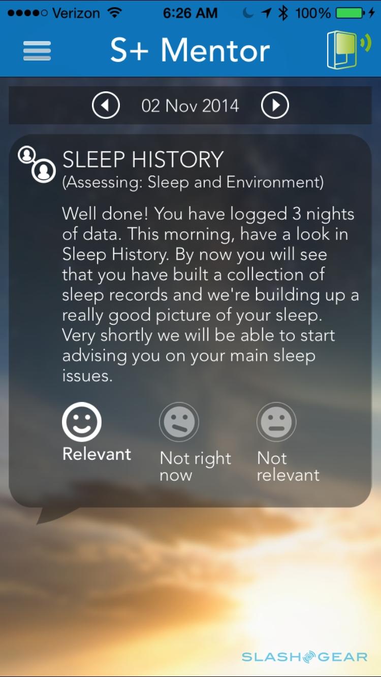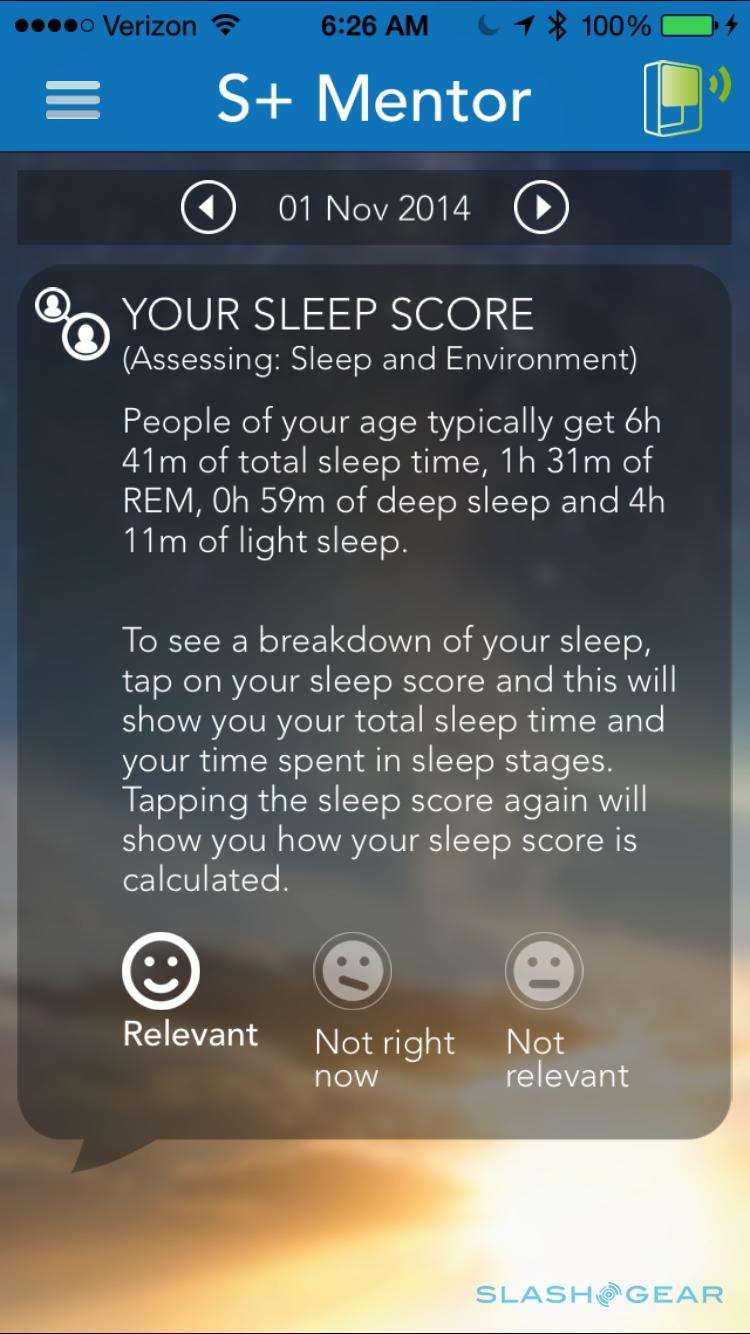 For a simple life, you can go by the overall score and glance at the two gages for REM and Deep sleep: effectively recharging your mind and your body, respectively. There's also S+ Mentor, which after a couple of days of tracking starts popping up advice and insights. They can range from the practical, like suggesting you may not have the S+ pointed at quite the right angle, through comparisons on how you slept versus others in your age range, to guidance on behavioral change.