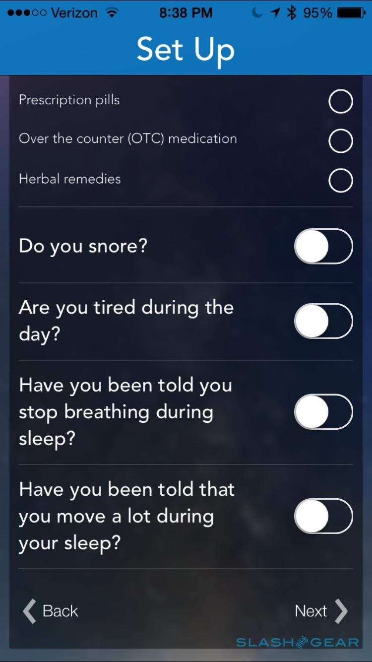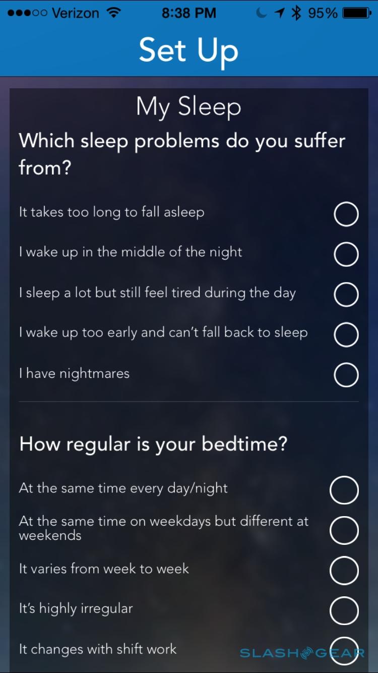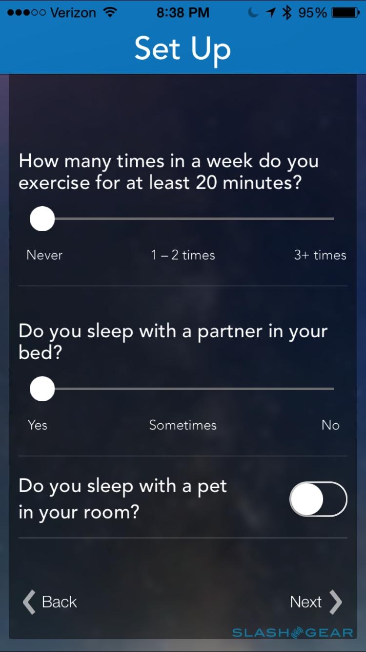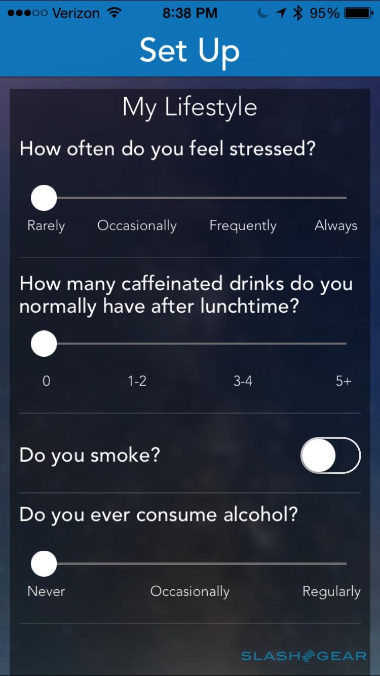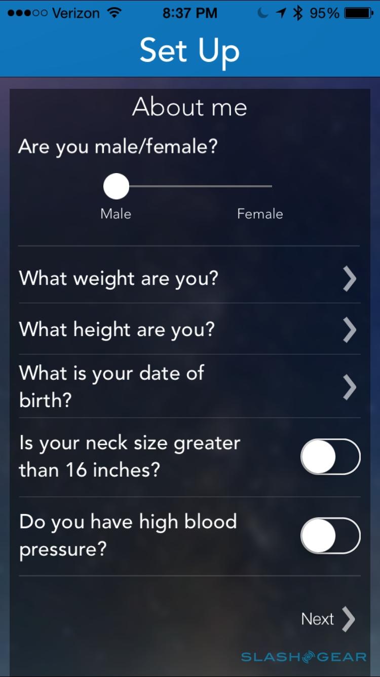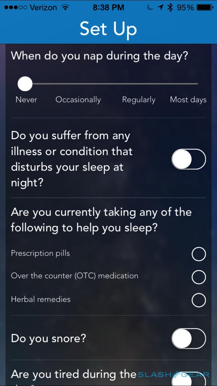 The heavy lifting is done with ResMed's app, available for iOS and Android. Setting up an account involves answering a long list of questions – everything from physical height and weight, through lifestyle factors which the company says could affect sleep patterns – and then pairing the sensor. On one or two occasions I had issues getting it to connect, but power-cycling Bluetooth on my device as well as the S+ itself remedied that.