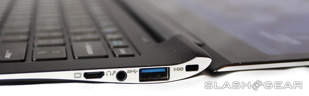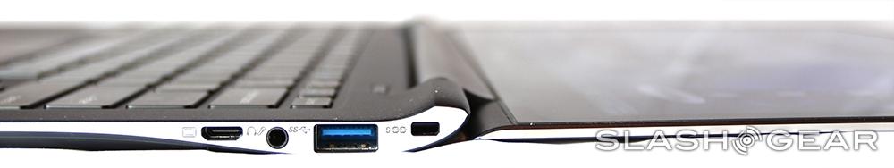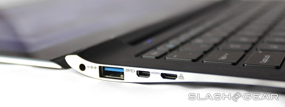 Also along the edges you've got a single micro-HDMI for outputting to massive displays, VGA if you've got the correct dongle, and Gigabit Wired Ethernet LAN with a dongle included with the notebook in-box. There's a single headphone-mic combo port and a multi-card slot as well, able to work with SD, SDHC, and SDXC cards – and it swings inward rather than pulling out, just about as top-notch as we've seen in an otherwise open or awkward port situation.