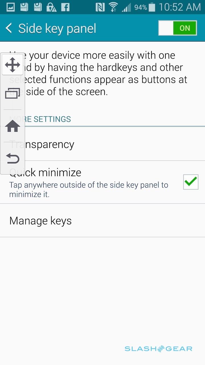 The Reduce Screen Size feature also puts buttons for the app switcher, home, back, and volume up/down at the bottom of that pane, but there's a separate Side Key Panel option which puts a pull-out shortcut menu for things like home, back, and the app menu on the left edge of the display. One-Handed Input, meanwhile, shrinks down input areas like the calculator, phone keypad, and on-screen keyboard, moving them to either the left or the right of the screen so that they're more easily stabbed at with a thumb.