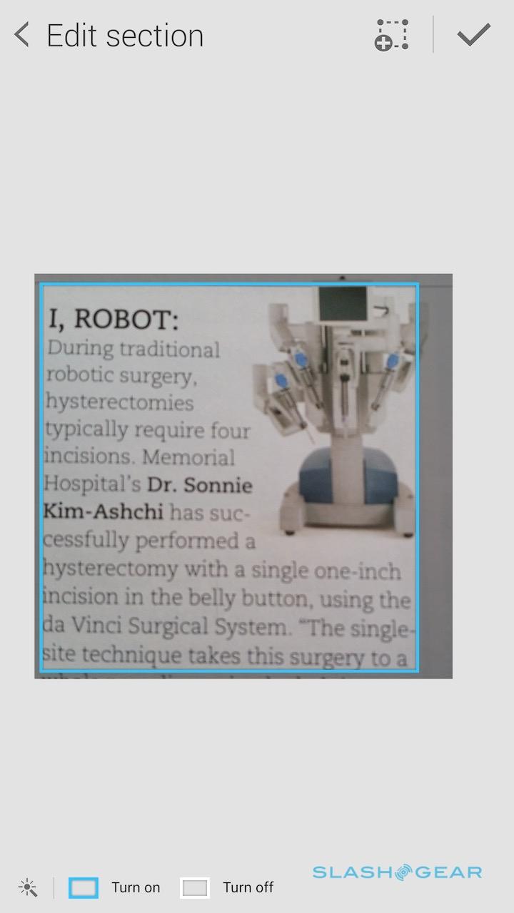 Dragging the edges of the selection box around means you can take into account capture skew – useful if you're not dead-center to the whiteboard – and then Photo Note processes it accordingly. If it's text, you can have the app try to remove the background color: the Note 4 does a surprisingly good job of replacing paper hue with plain white, for instance.