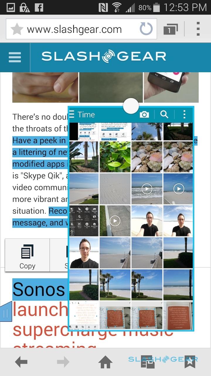 Samsung has had tools to make one-handed use of its bigger phones more straightforward for some time now, but they get a refresh on the Note 4. Swiping your thumb from the side of the screen to the middle and back again shrinks down the display, aligning it to whichever side you swiped from. You can then resize the window further, or maximize it again.