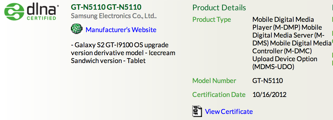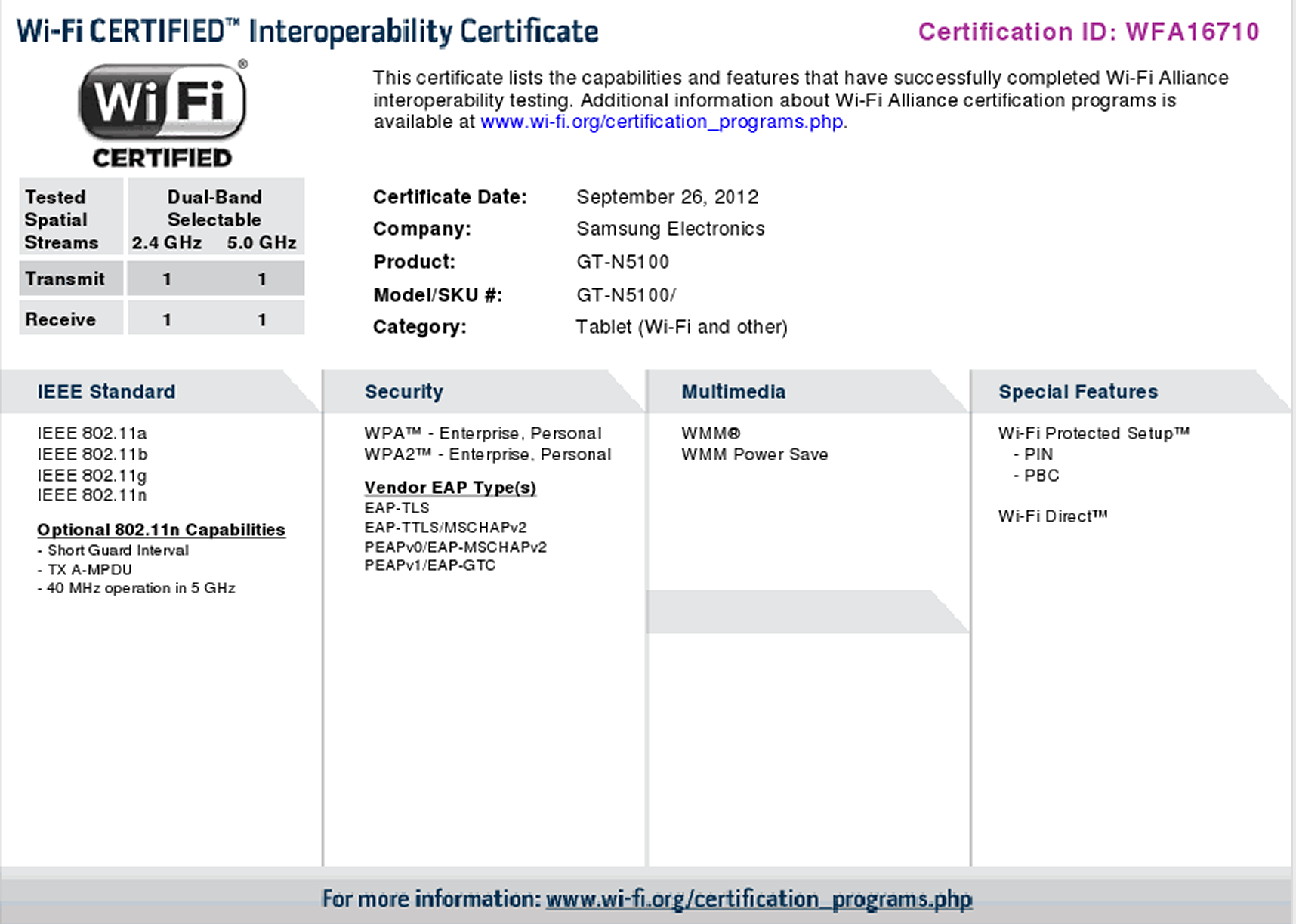 Interestingly, the GT-5100 also passed through the Wi-Fi Alliance certification program recently as well, though there's some confusion around certification IDs. According to Google's copy of the record, the GT-5100 is described as a "WiFi and other" tablet with WiFi 1/b/g/n (2.4/5GHz) support and WiFi Direct, though the certificate itself [pdf link] is for the GT-T8025, a different tablet.