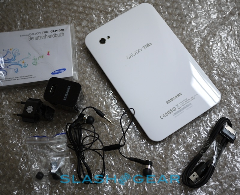 Once we got inside the wooden crate, and then through the various layers of bubble-wrap, the Galaxy Tab itself is surprisingly small. Samsung don't include much in the way of accessories, either; you get a USB AC adapter, a USB cable to Samsung's non-standard charge/sync port, a wired stereo hands-free kit and some printed documentation, but no case or anything else. Of course, the company also has plenty of official accessories – including a keyboard dock and an HDMI dock – so it's in their best interest to keep you wanting.