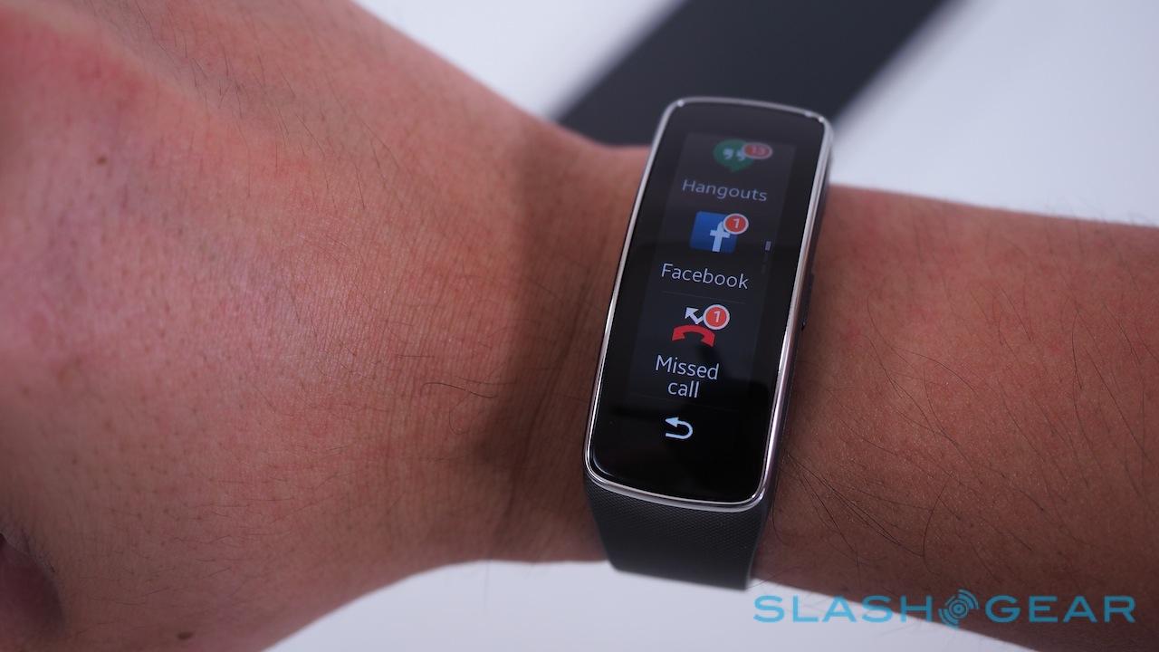 Is that useful? It is when you're in the shower and an important message comes in from friends or family: Gear Fit doesn't just show an icon, but previews the message itself, whether it was an SMS, Google Hangouts IM, or through Facebook Messenger. Unfortunately you can't reply with a custom message, only a preconfigured on, which can also be used to reject incoming calls.